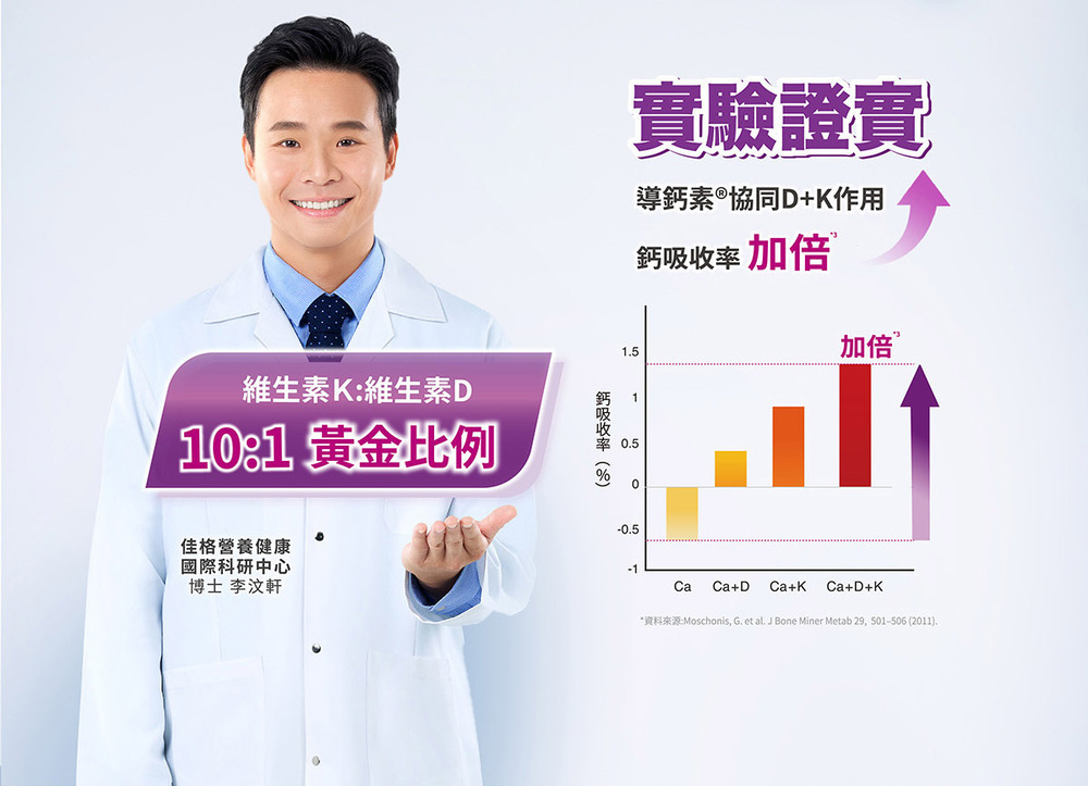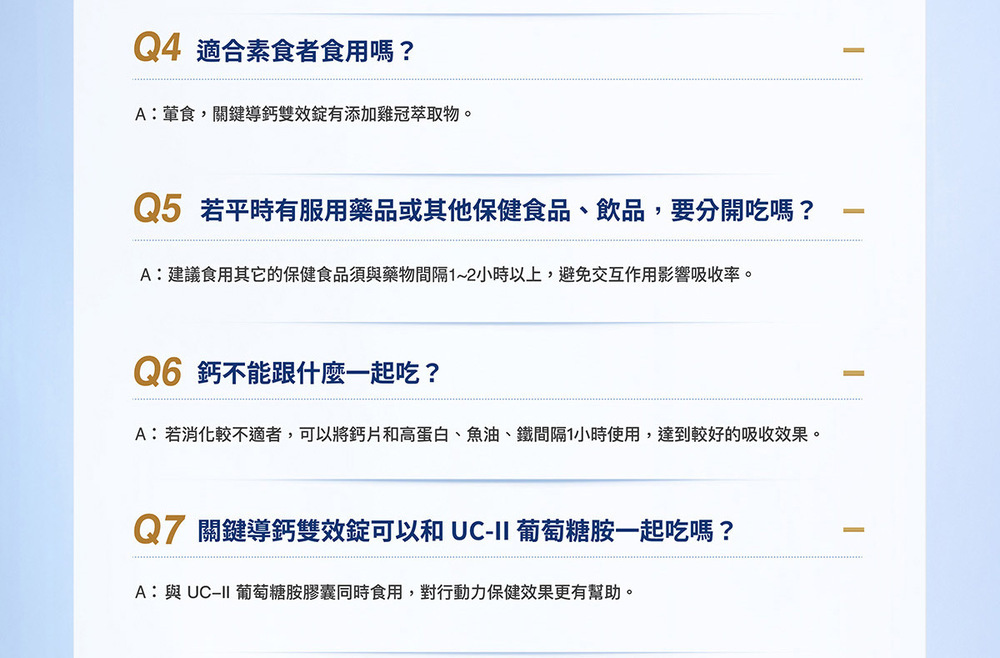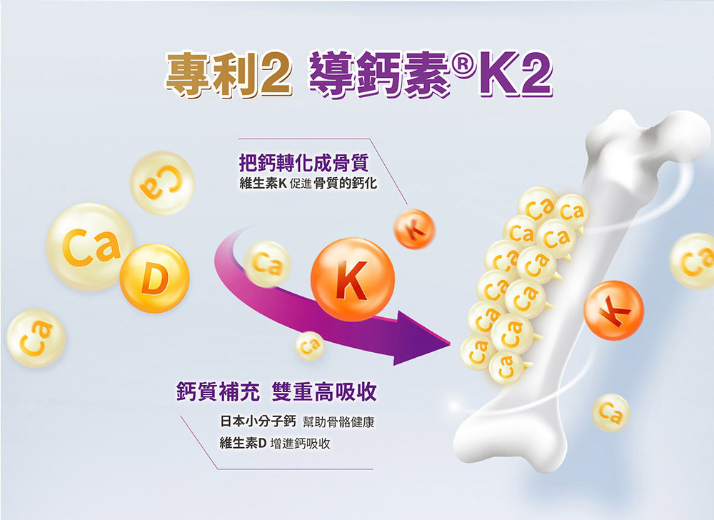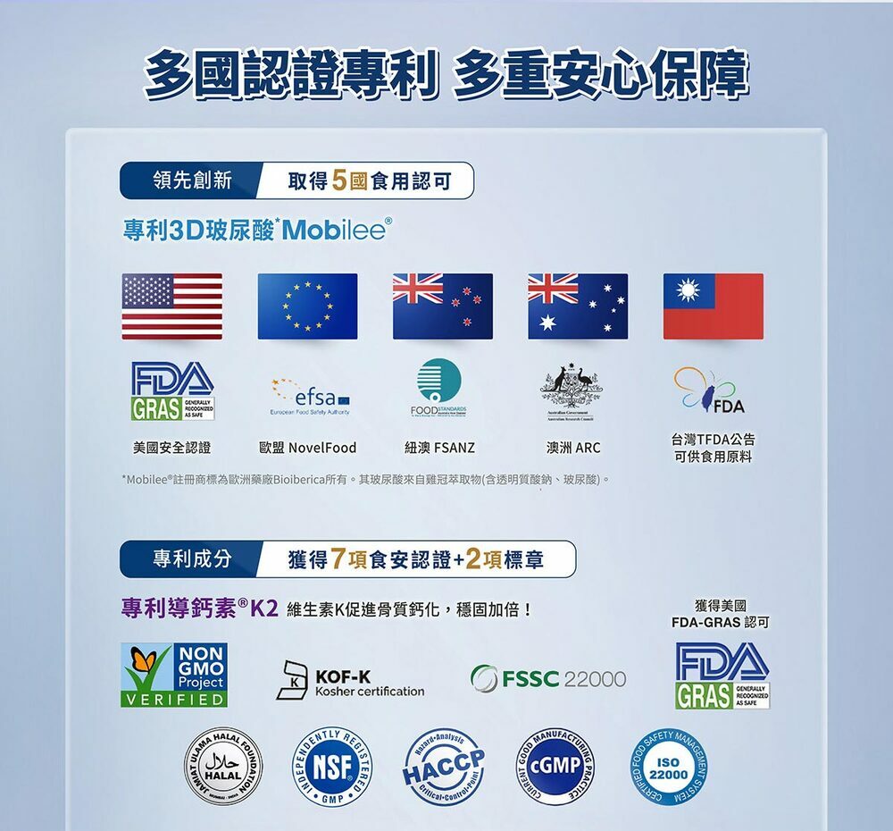 | 成分/內容物 | 碳酸鈣、鷹嘴豆發酵萃取物(阿拉伯膠、蔗糖、鷹嘴豆發酵萃取物〈含維生素K2〉)、雞冠萃取物(含透明質酸鈉)、羥丙基甲基纖維素、二氧化矽、維生素D3、硬脂酸鎂 |