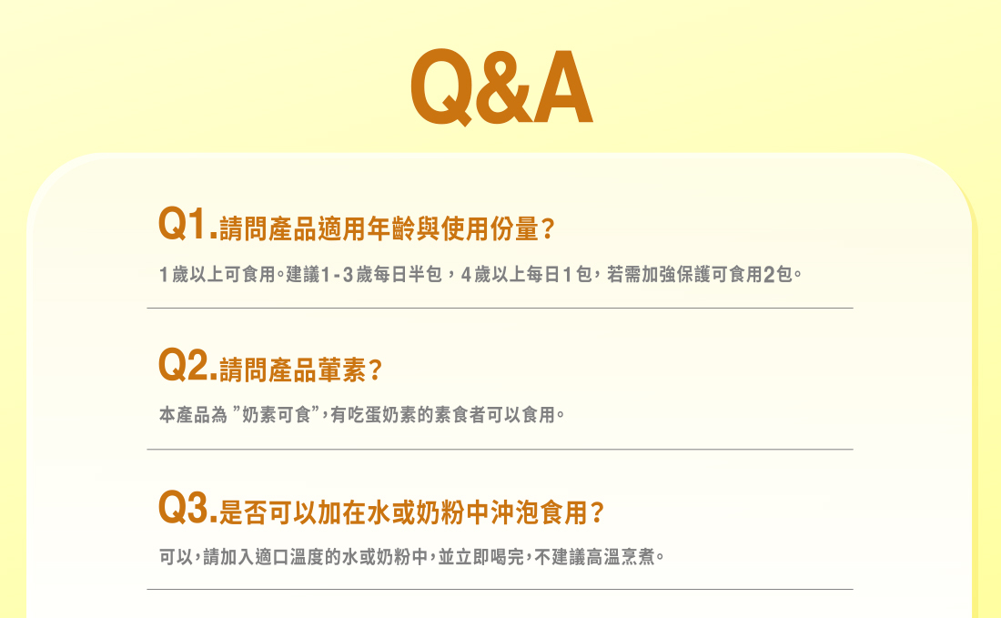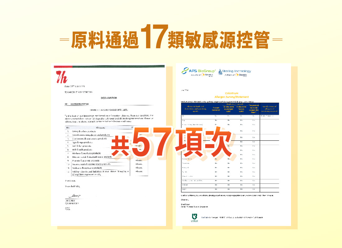 | 成分/內容物 | 本產品含有牛奶。糊精纖維、乳糖醇(甜味劑)、初乳粉(含免疫球蛋白IgG)(牛初乳、濃縮牛奶蛋白、脫脂奶粉、香料、向日葵卵磷脂)、果寡醣、難消化性麥芽糊精、柳橙果汁粉(柳橙濃縮汁、麥芽糊精)、葡萄糖、乳酸菌[A、B、C健康三益菌(Bifidobacterium lactis、Lactobacillus acidophilus、Lactobacillus paracasei)、Lactobacillus paracasei BRAP-01、Lactobacillus rhamnosus HN001、Lactobacillus crispatus KT-11(熱去活)]、香料、麥芽糊精、非氫化棕櫚仁油、檸檬酸、乳清粉、羧甲基纖維素鈉。 |
