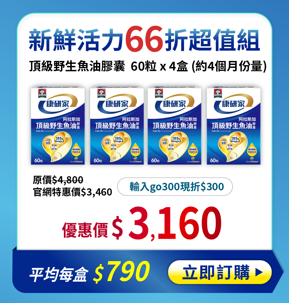 (66折超值組!) 桂格康研家 頂級野生魚油膠囊60粒x4盒 [輸碼折300,折後$3,160]