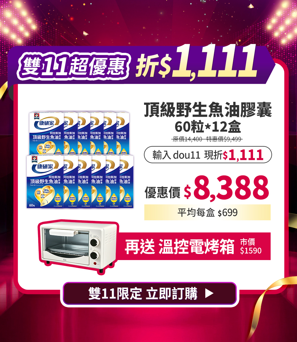 (瘋狂雙11下單就折$1111 再送電烤箱) 桂格康研家頂級野生魚油膠囊60粒x12盒 [輸入dou11現折$1111,再送時尚雙旋鈕電烤箱,折後價$8388,單盒只要$699]