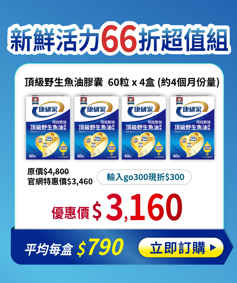 (下單再折$300,66折超值組!) 桂格康研家 頂級野生魚油膠囊60粒x4盒 [輸碼go300折300,折後$3,160]