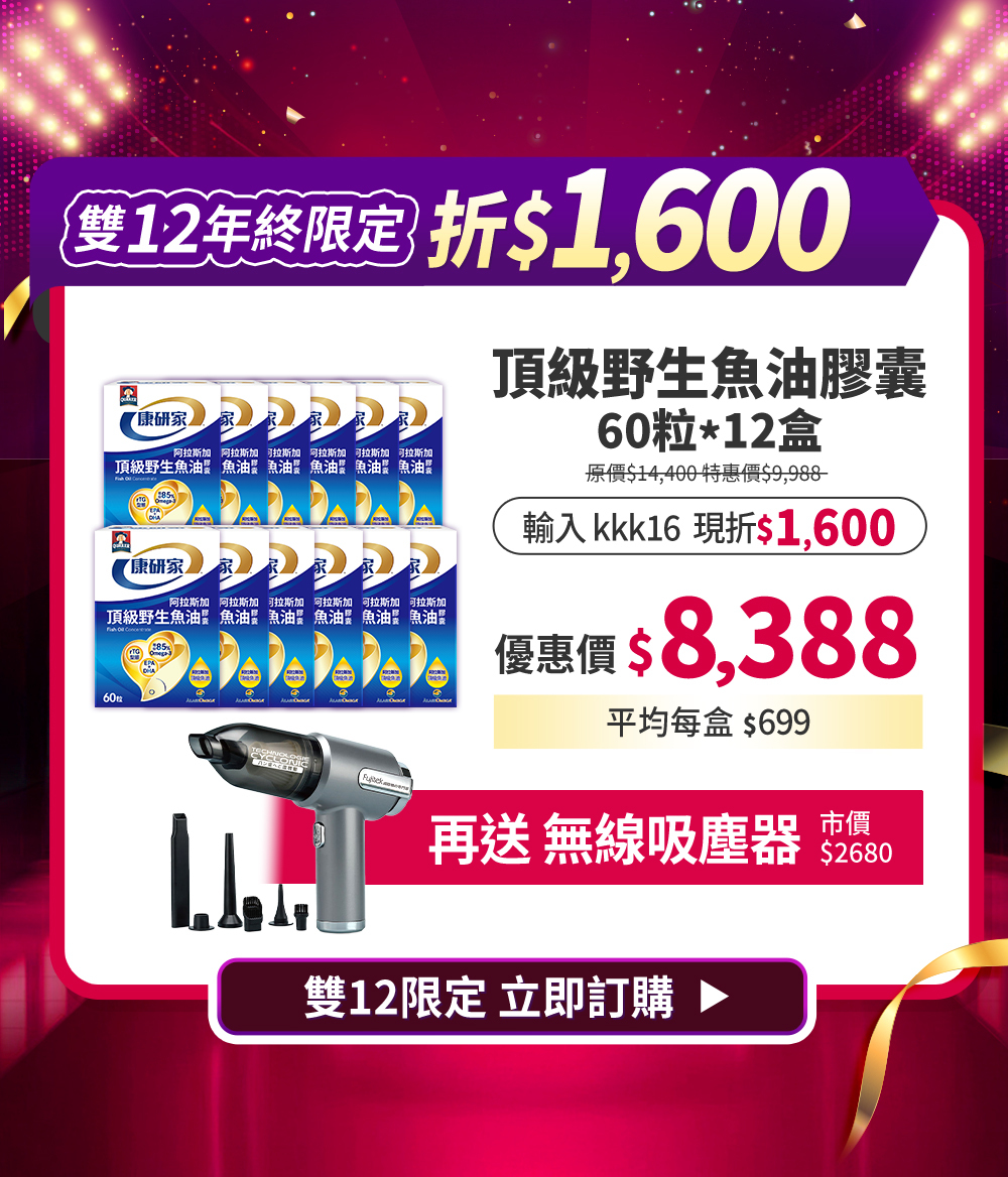 (雙12特惠只有今天! 下單折$1600 再送無線吸塵器) 桂格康研家頂級野生魚油膠囊60粒x12盒 [輸入kkk16 現折$1600,再送無線多頭吸塵器,折後價$8388,單盒只要$699]