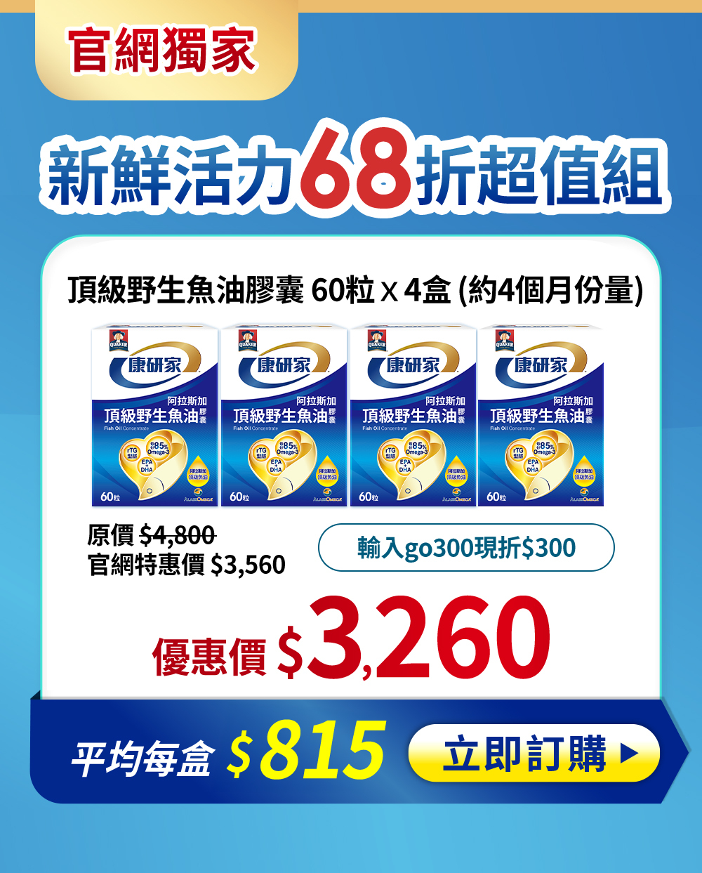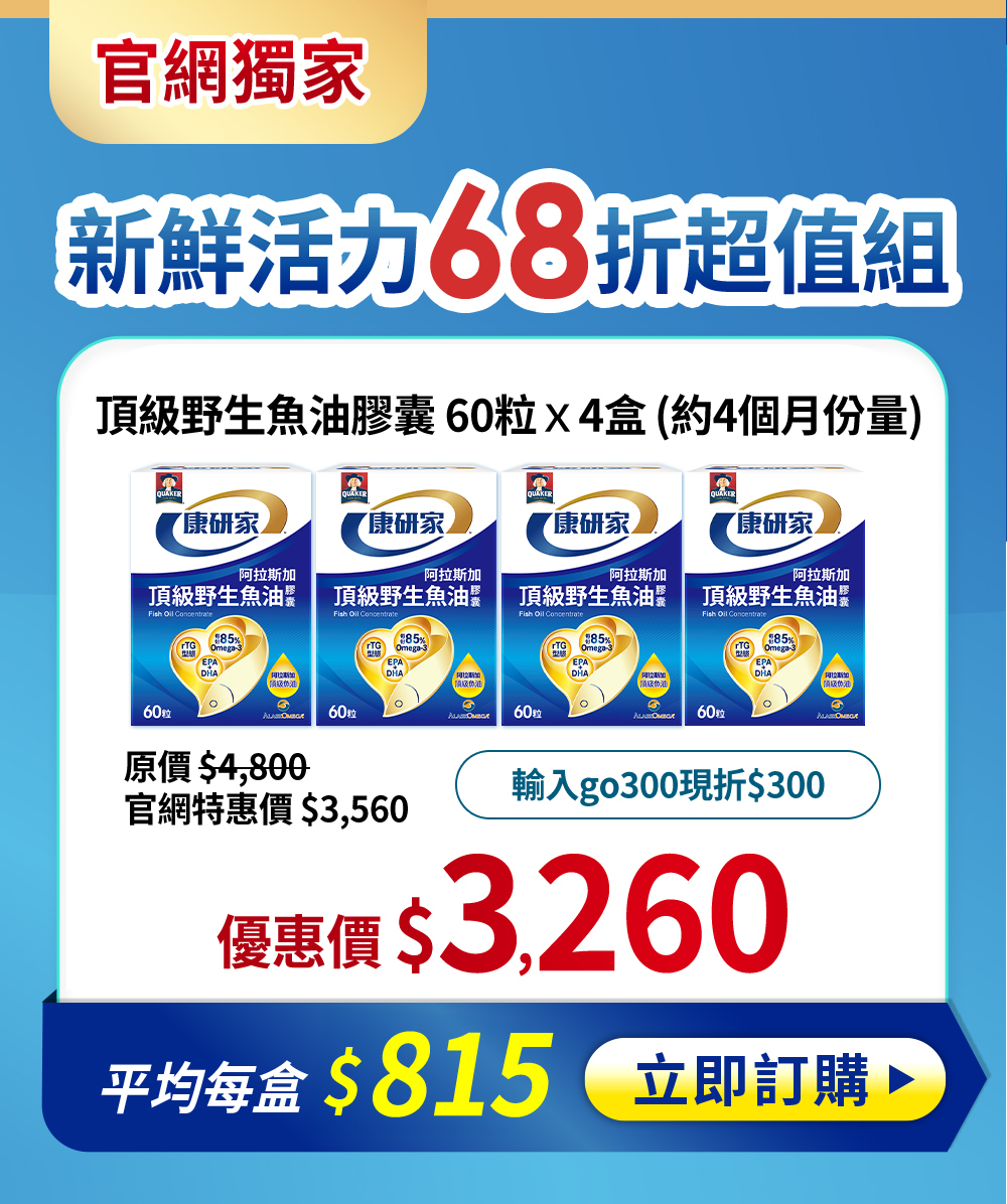 (下單再折$300,68折超值組!) 桂格康研家 頂級野生魚油膠囊60粒x4盒 [輸碼go300折300,折後$3,260]