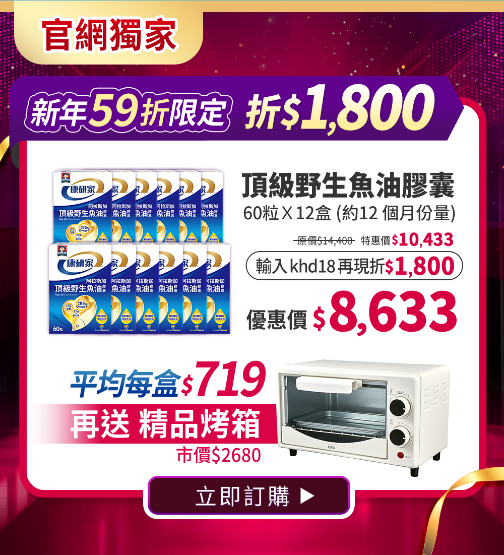 (新春特惠組! 下單折$1800 再送時尚烤箱) 桂格康研家頂級野生魚油膠囊60粒x12盒 [輸入khd18 現折$1800,折後價$8633,再送時尚溫控烤箱(市價$1590)]