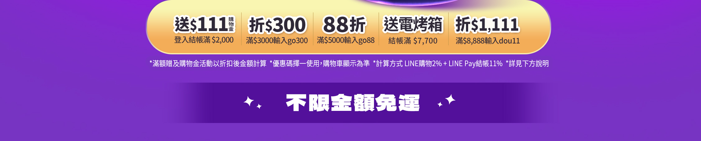 • 全站消費滿$3,000折$300,滿$5,000享88折,滿$8,888折$1111 需輸入優惠碼,結帳時擇一使用; 如有其他使用限制請依各產品頁面標註為準。