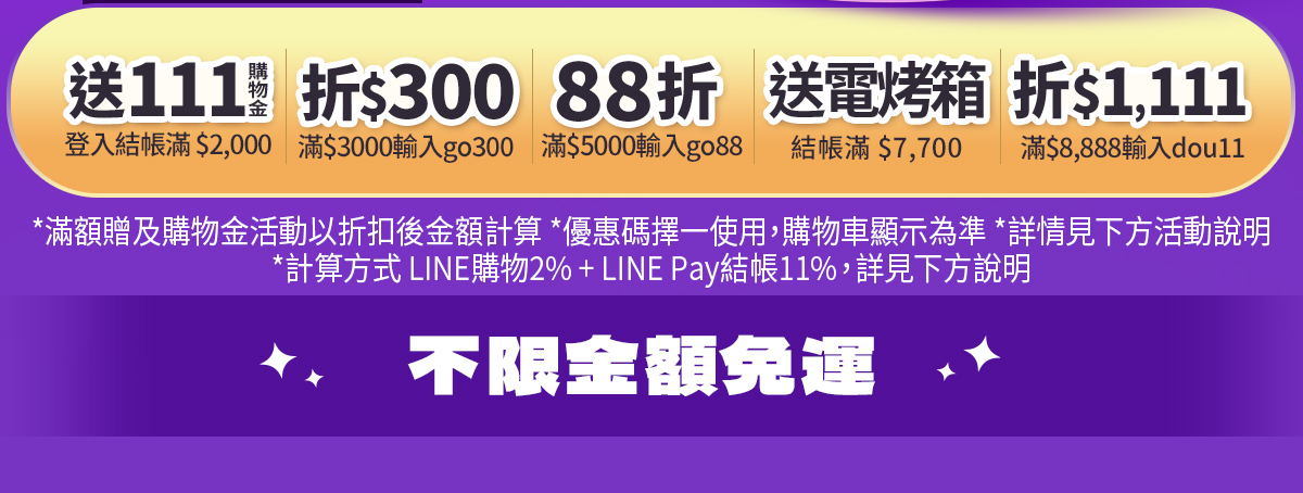 • 全館滿$2,000送111購物金,以整筆訂單折扣後的結帳金額計算,購物金不累贈,以購物車顯示為準,且下次使用。