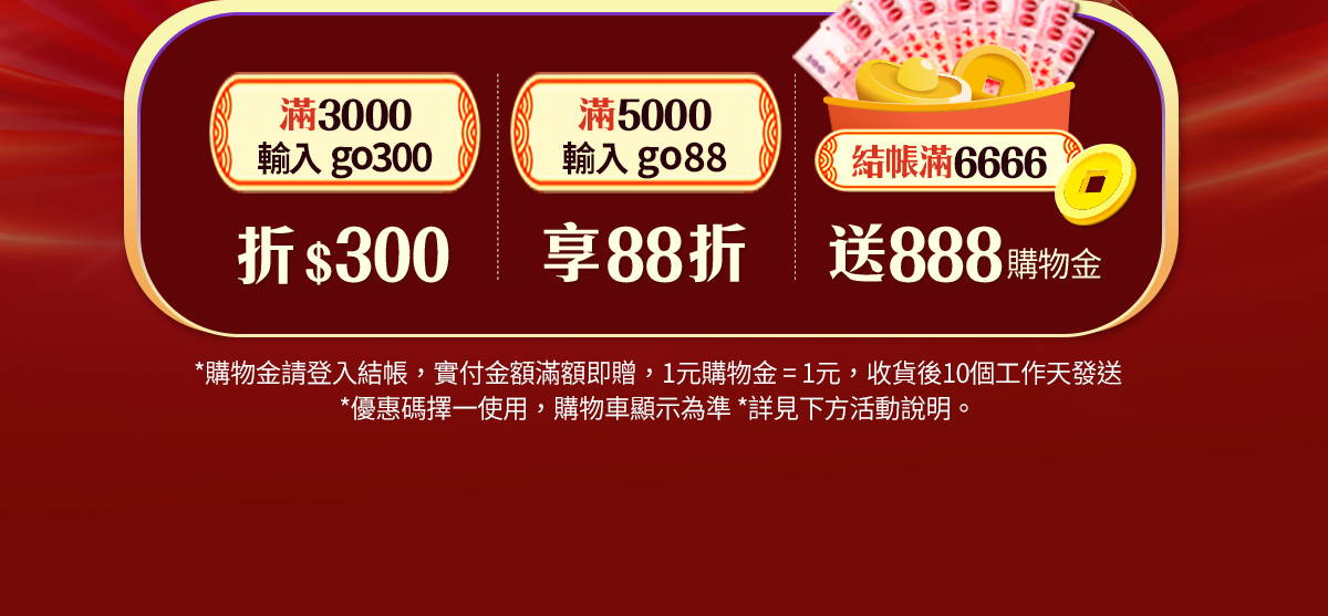 • 回饋活動結帳滿$3,666送666購物金、滿$6,666送888購物金,以整筆訂單折扣後的結帳金額為準,以購物車顯示為準,且下次使用。
