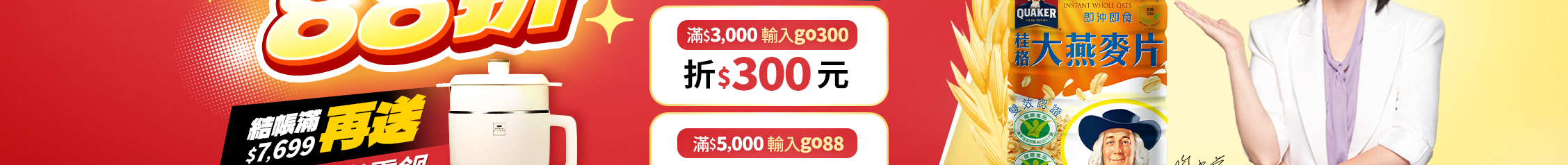• 全站消費滿$3,000折$300,滿$5,000享88折 需輸入優惠碼,結帳時擇一使用; 如有其他使用限制請依各產品頁面標註為準。