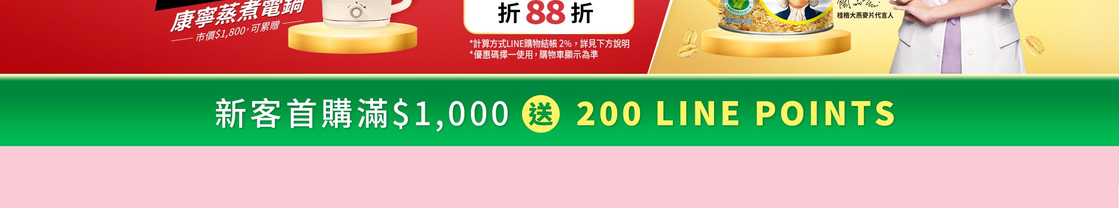 • 透過 LINE購物跳轉佳格健康GO 完成訂單,LINE購物點數回饋 LINE POINTS,單一商品回饋上限為 100點。 (例如:點數回饋8%,單一商品消費金額1000元*8%=80,獲得80點 ; 單一商品消費金額5000元*8%=400,獲得100點)