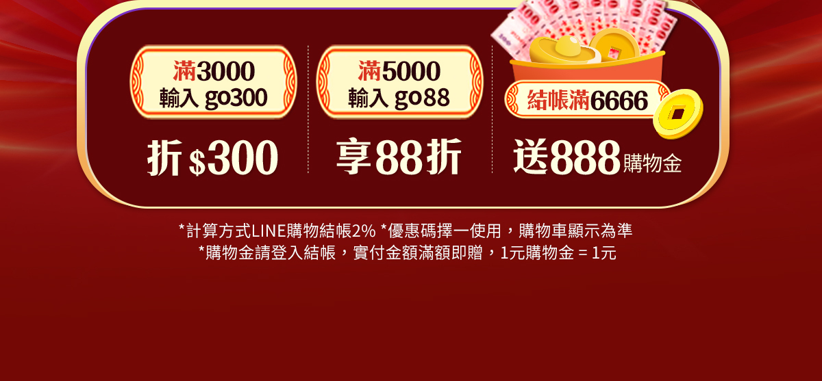 • 回饋活動結帳滿$3,666送666購物金、滿$6,666送888購物金,以整筆訂單折扣後的結帳金額為準,以購物車顯示為準,且下次使用。