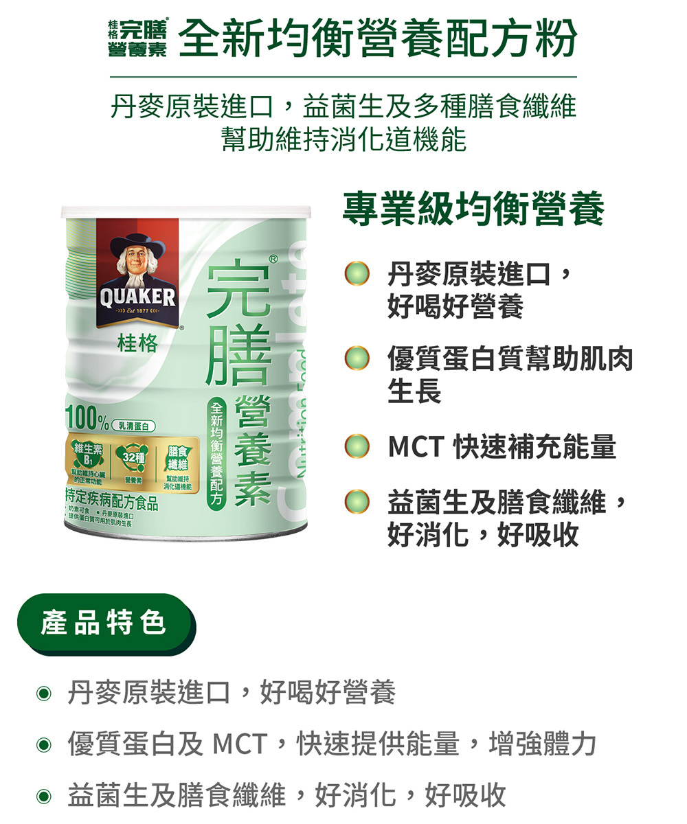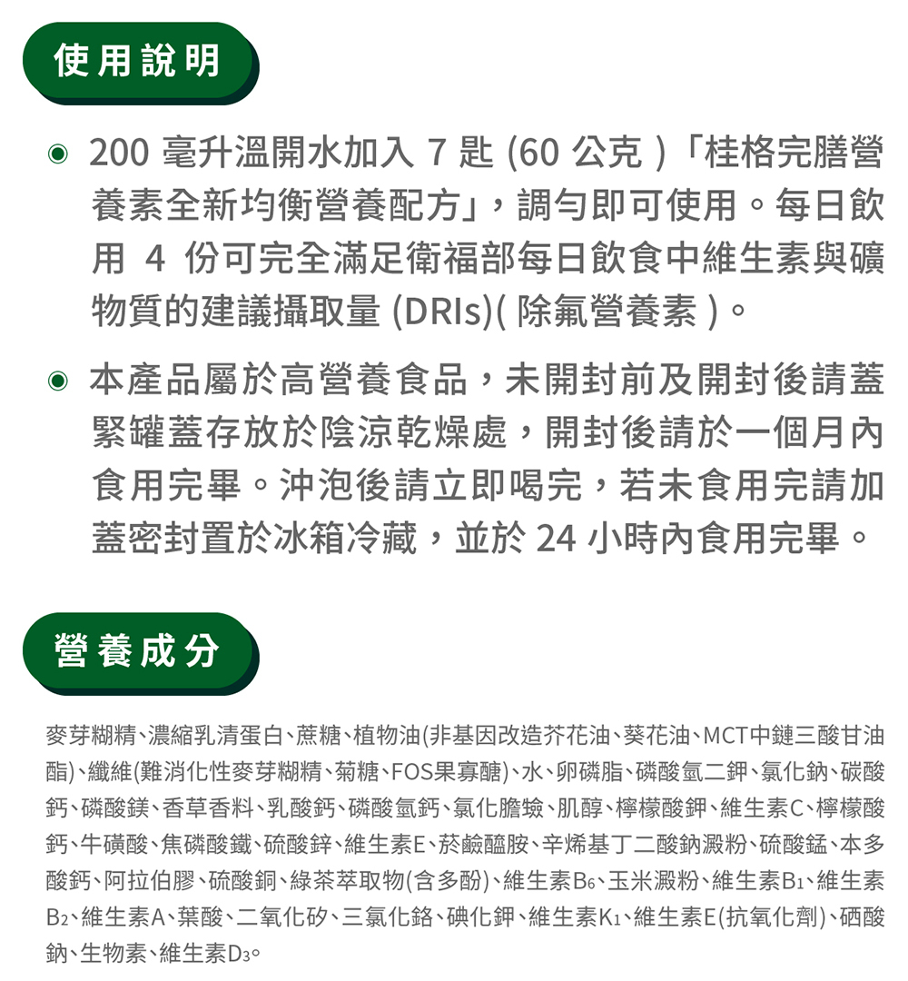 | 成分/內容物 | 麥芽糊精、濃縮乳清蛋白、蔗糖、植物油(非基因改造芥花油、葵花油、MCT(中鏈三酸甘油酯)、纖維(難消化性麥芽糊精、菊糖、FOS果寡醣)、水、卵磷脂、磷酸氫二鉀、氯化鈉、碳酸鈣、磷酸鎂、香草香料、乳酸鈣、磷酸氫鈣、氯化膽生僉、肌醇、檸檬酸鉀、維生素C、檸檬酸鈣、牛磺酸、焦磷酸鐵、硫酸鋅、維生素E、菸鹼醯胺、辛烯基丁二酸鈉澱粉、硫酸錳、本多酸鈣、阿拉伯膠、硫酸銅、綠茶萃取物(含多酚)、維生素B6、玉米澱粉、維生素B1、維生素B2、維生素A、葉酸、二氧化矽、三氯化鉻、碘化鉀、維生素K1、維生素E(抗氧化劑)、硒酸鈉、生物素、維生素D3 |