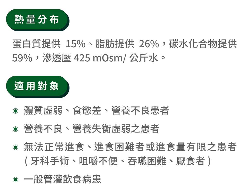 .無法正常進食、進食困難者或進食量限之患者(牙科手術、咀嚼不便、吞嚥困難、厭食者)