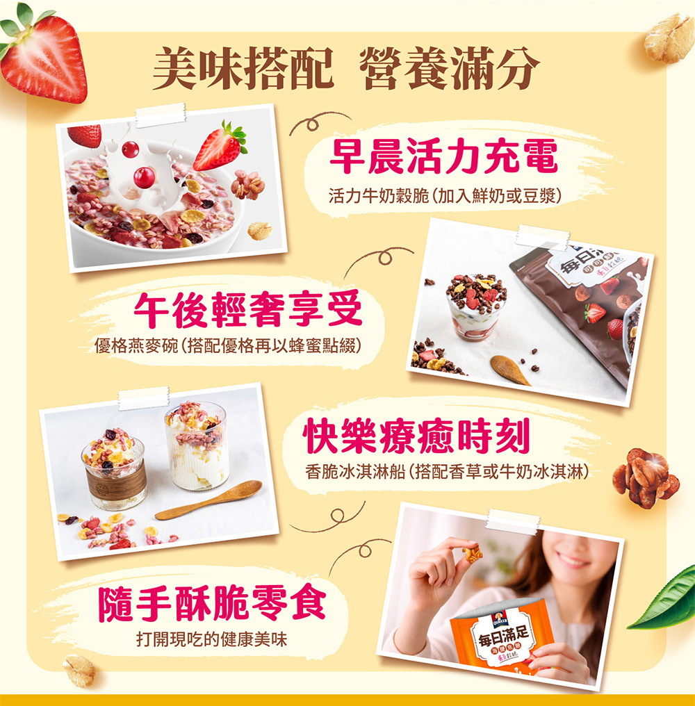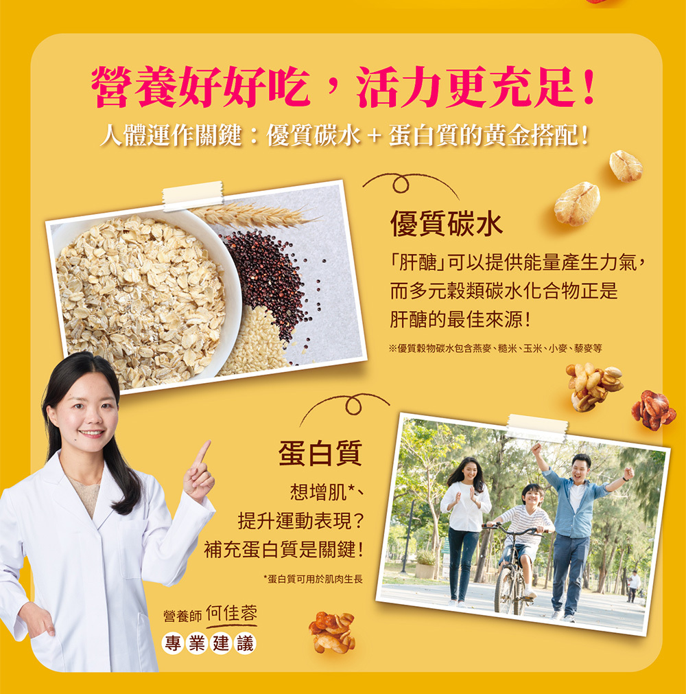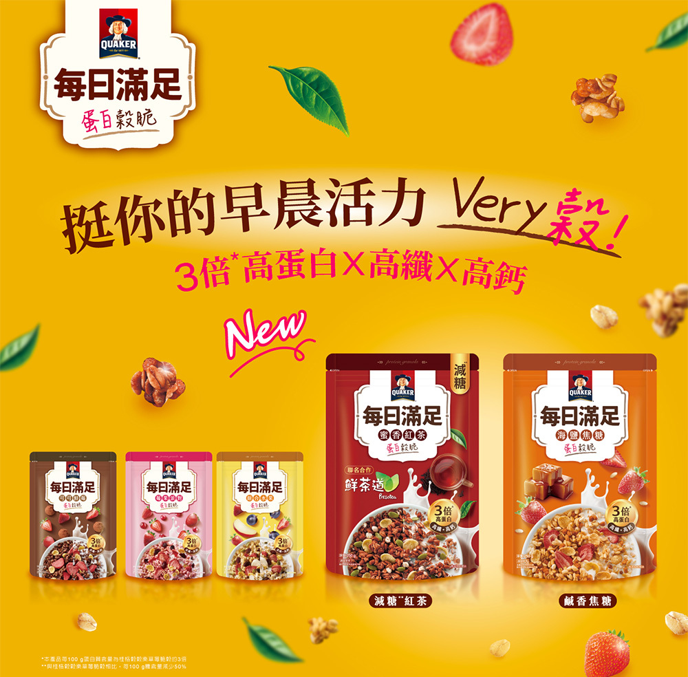 結合燕麥、糙米、小米等多元穀物與優質植物蛋白脆粒,每份至少含有14%蛋白質,高纖、高鈣,健康營養每日滿足!