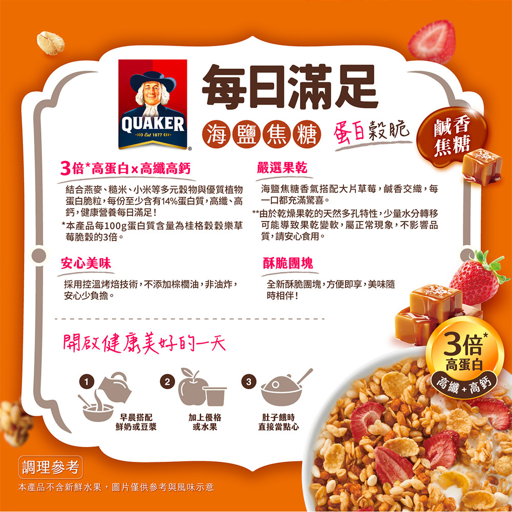 *本產品每100 g蛋白質含量為桂格穀穀樂草莓脆穀的3倍