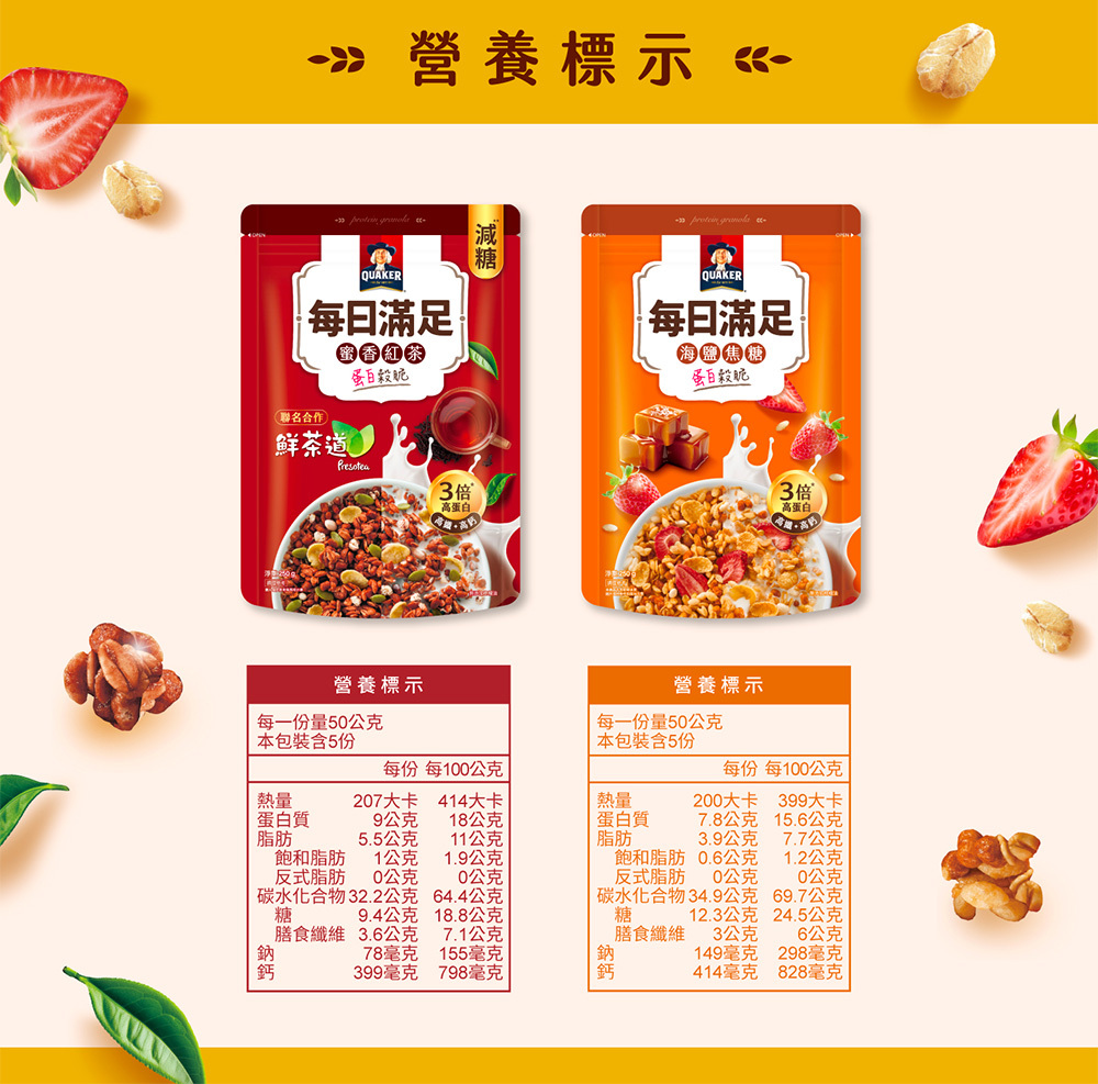 成分/內容物 海鹽焦糖風味:燕麥、玉米片[綜合穀物(玉米、米、小麥、大麥)、蔗糖、食鹽、麥芽抽出物、碳酸鈣、可可脂、全脂奶粉、麥芽糊精、大豆卵磷脂、天然香草香料]、分離大豆蛋白、蔗糖、糙米、白米、果糖、小米、奶粉、小麥纖維、麥芽糊精、芥花油、碳酸鈣、蕎麥、焦糖香料、草莓、樹薯澱粉、黑糖、黃豆、海鹽、黑糯米、薏仁、藜麥、黑豆、綠豆、紅豆、大豆卵磷脂、混合濃縮生育醇-抗氧化劑*本產品含有含麩質之穀物、牛奶、大豆。蜜香紅茶風味:燕麥、分離大豆蛋白、蔗糖、糙米、南瓜子、蕎麥、玉米片[綜合穀物(玉米、米、小麥、大麥)、蔗糖、食鹽、麥芽抽出物、碳酸鈣、可可脂、全脂奶粉、麥芽糊精、大豆卵磷脂、天然香草香料]、小米、奶粉、麥芽糊精、小麥纖維、白米、果糖、芥花油、碳酸鈣、樹薯澱粉、香料、紅茶粉、黑糖、黃豆、黑糯米、薏仁、藜麥、黑豆、綠豆、紅豆、大豆卵磷脂、混合濃縮生育醇-抗氧化劑*本產品含有含麩質之穀物、大豆、牛奶。