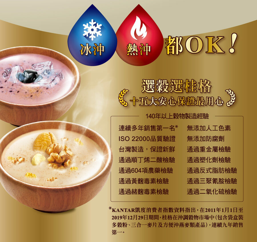 | 成分/內容物 | 燕麥、麥芽糊精、糙米、非氫化棕櫚仁油、膨發小麥、小麥纖維、綠豆、乳清粉、白芝麻、碳酸鈣、香料、關華豆膠、核桃、腰果、薏仁、維生素預混粉(維生素A、維生素D3、維生素E、維生素K、維生素B1,維生素B2、維生素B6、生物素、本多酸鈣、葉酸、菸鹼醯胺、維生素C、肌醇、牛磺酸、麥芽糊精)、栗子、葡萄糖酸鋅 |