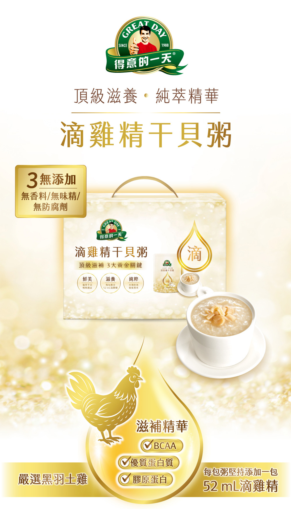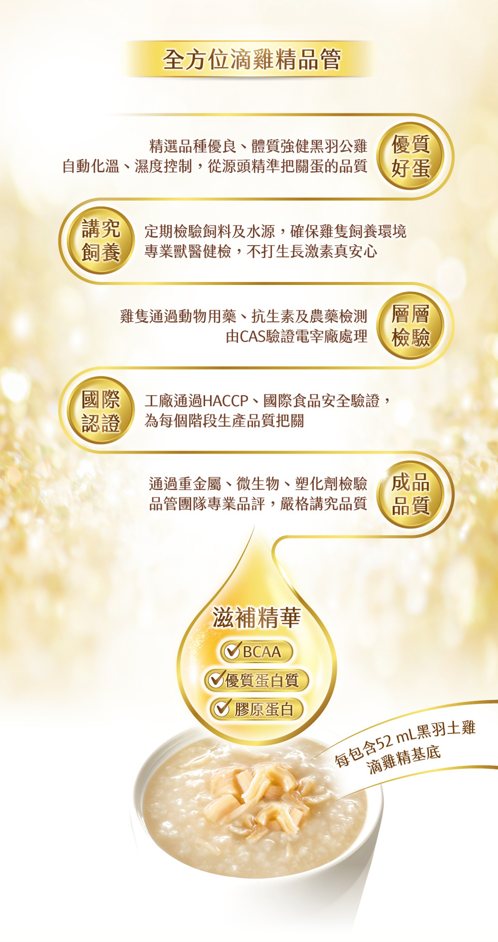 .嚴選健康黑羽土雞,與高品質干貝,每包粥堅持添加一包高達52ml的滴雞精 ! 提供充足滋補營養 (BCAA、優質蛋白質、膠原蛋白)