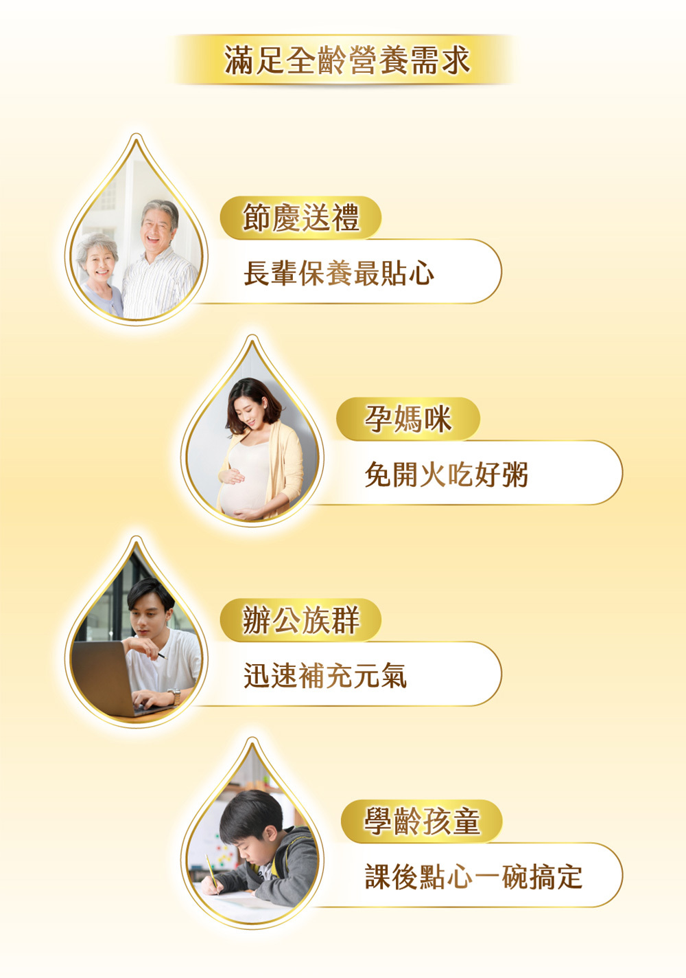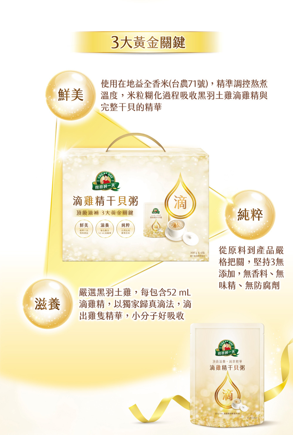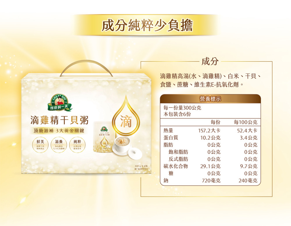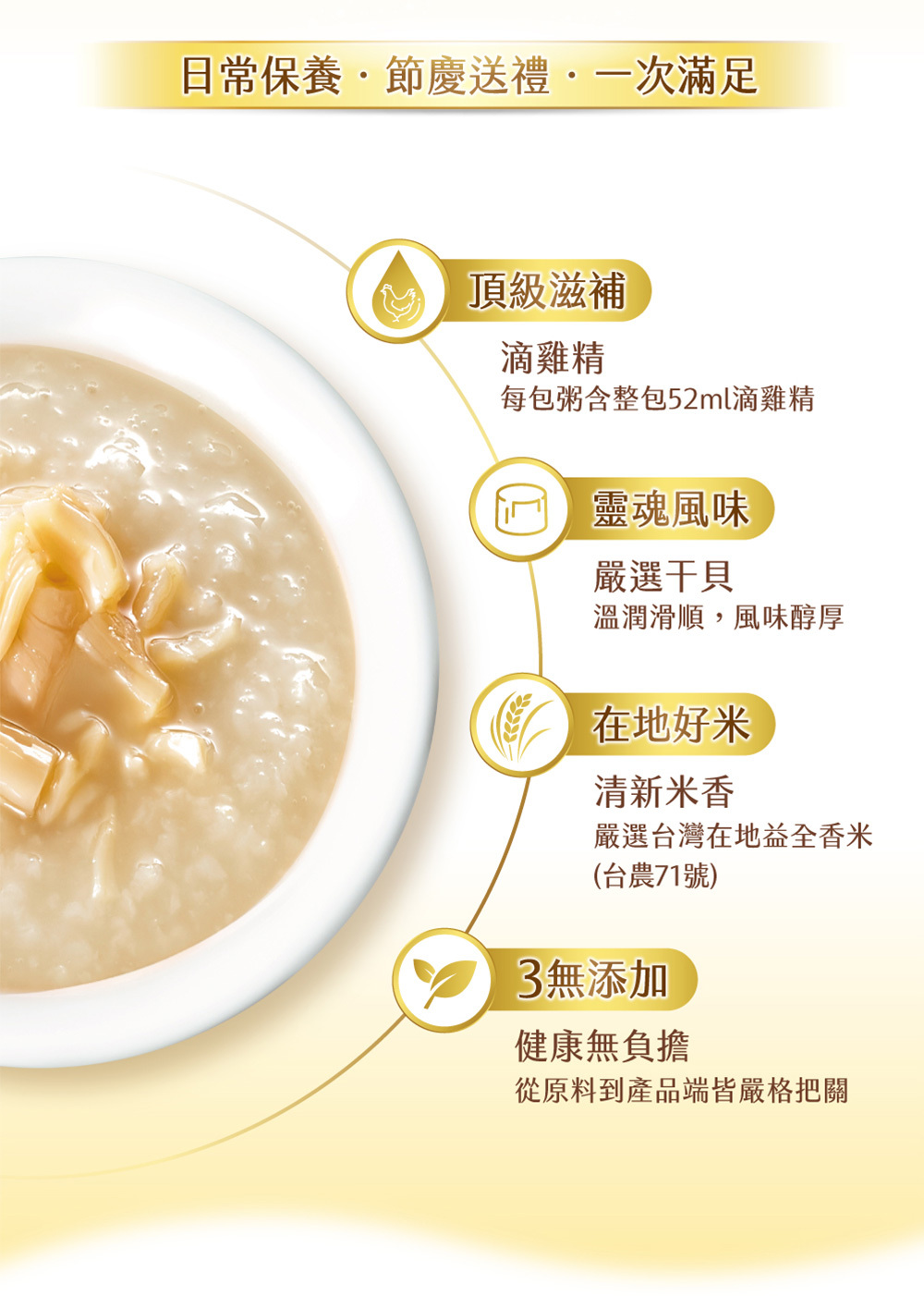 | 成分/內容物 | 滴雞精高湯(水、滴雞精)、白米、干貝、食鹽、蔗糖、維生素E-抗氧化劑 |