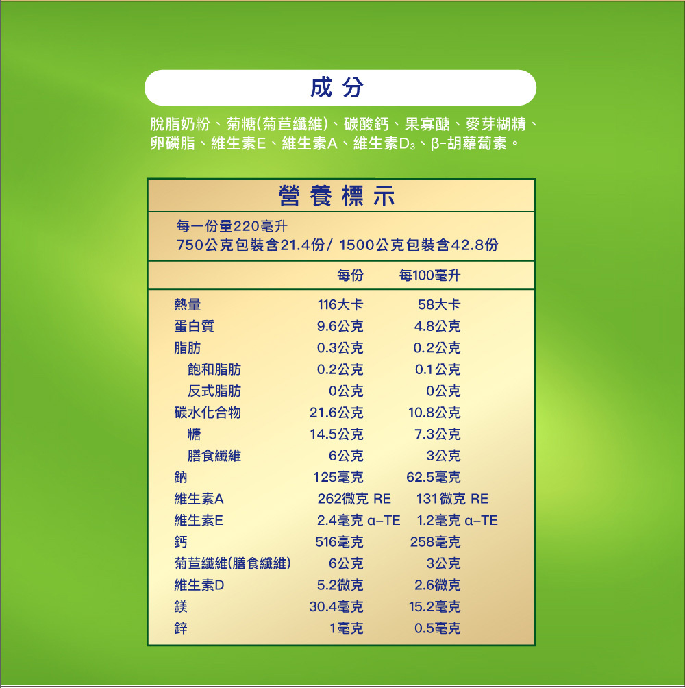 成分/內容物 脫脂奶粉、、菊糖(菊苣纖維)、碳酸鈣、果寡醣、麥芽糊精、卵磷脂、維生素E、維生素A、維生素D3、β-胡蘿蔔素。本產品含有牛奶、大豆。