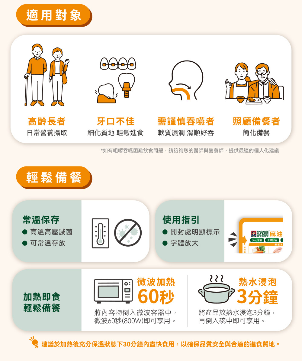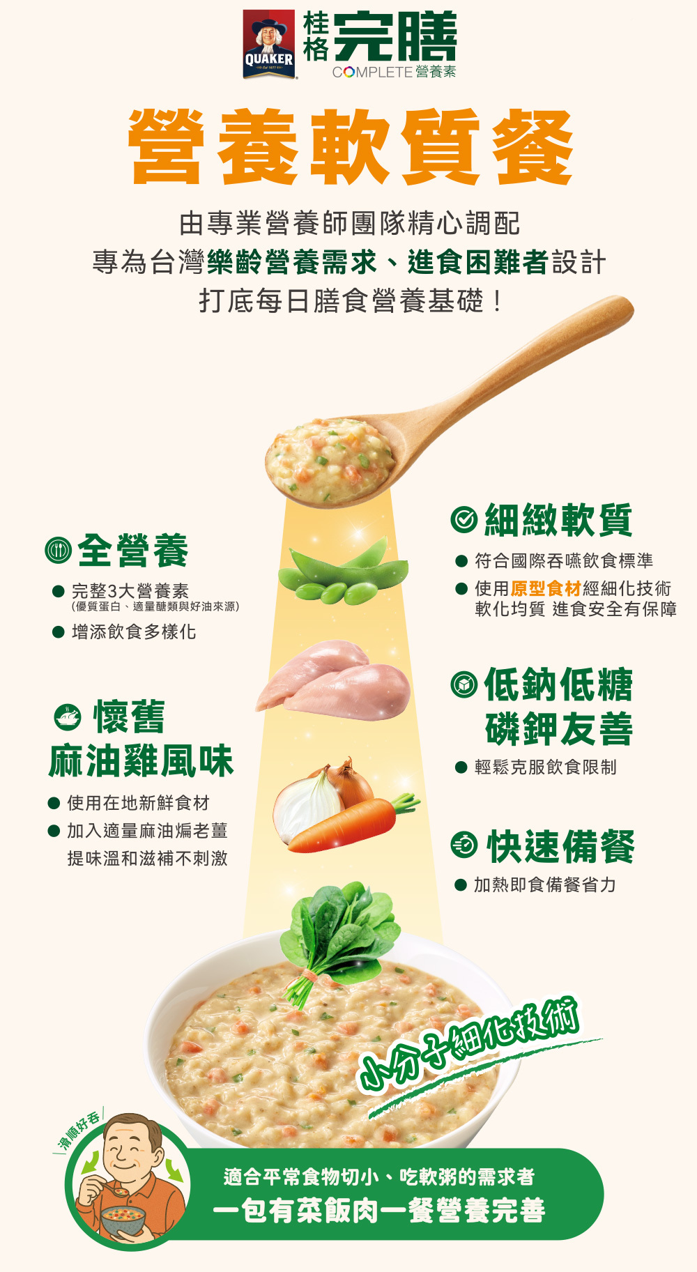 專為台灣長者營養需求設計,滋補營養、增強體力,提供一餐所需營養、軟質好進食,由專業營養師團隊精心調配,使用在地食材、軟質易食、營養美味。
