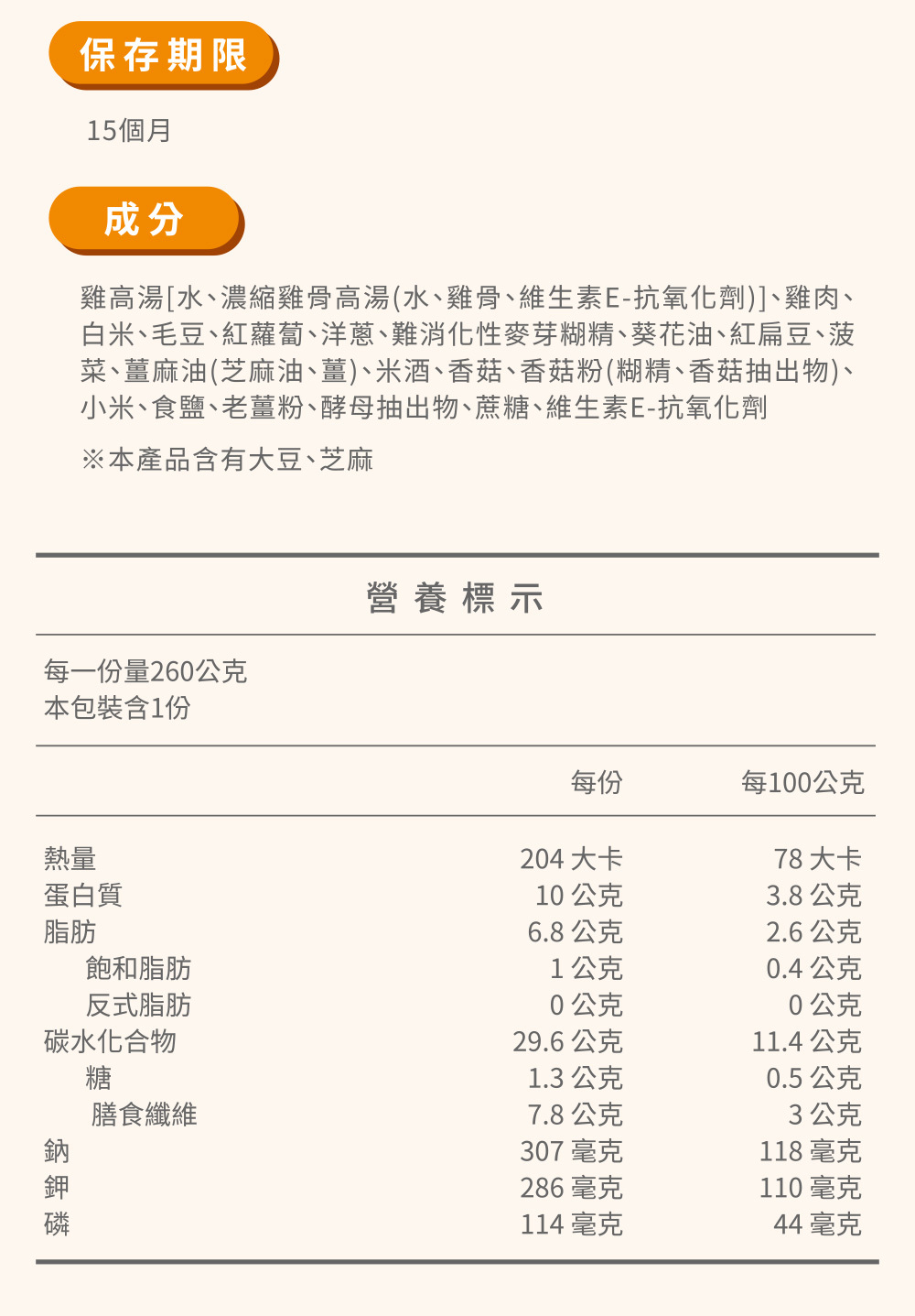 成分/內容物 雞高湯[水、濃縮雞骨高湯(水、雞骨、維生素E-抗氧化劑)]、雞肉、白米、毛豆、紅蘿蔔、洋蔥、難消化性麥芽糊精、葵花油、紅扁豆、菠菜、薑麻油(芝麻油、薑)、米酒、香菇、香菇粉(糊精、香菇抽出物)、小米、食鹽、老薑粉、酵母抽出物、蔗糖、維生素E-抗氧化劑
