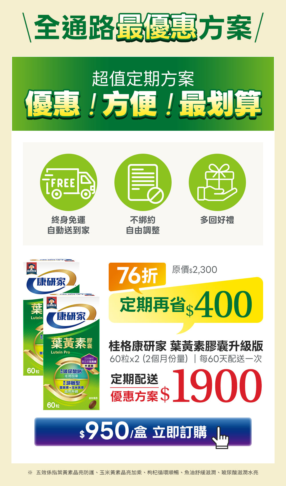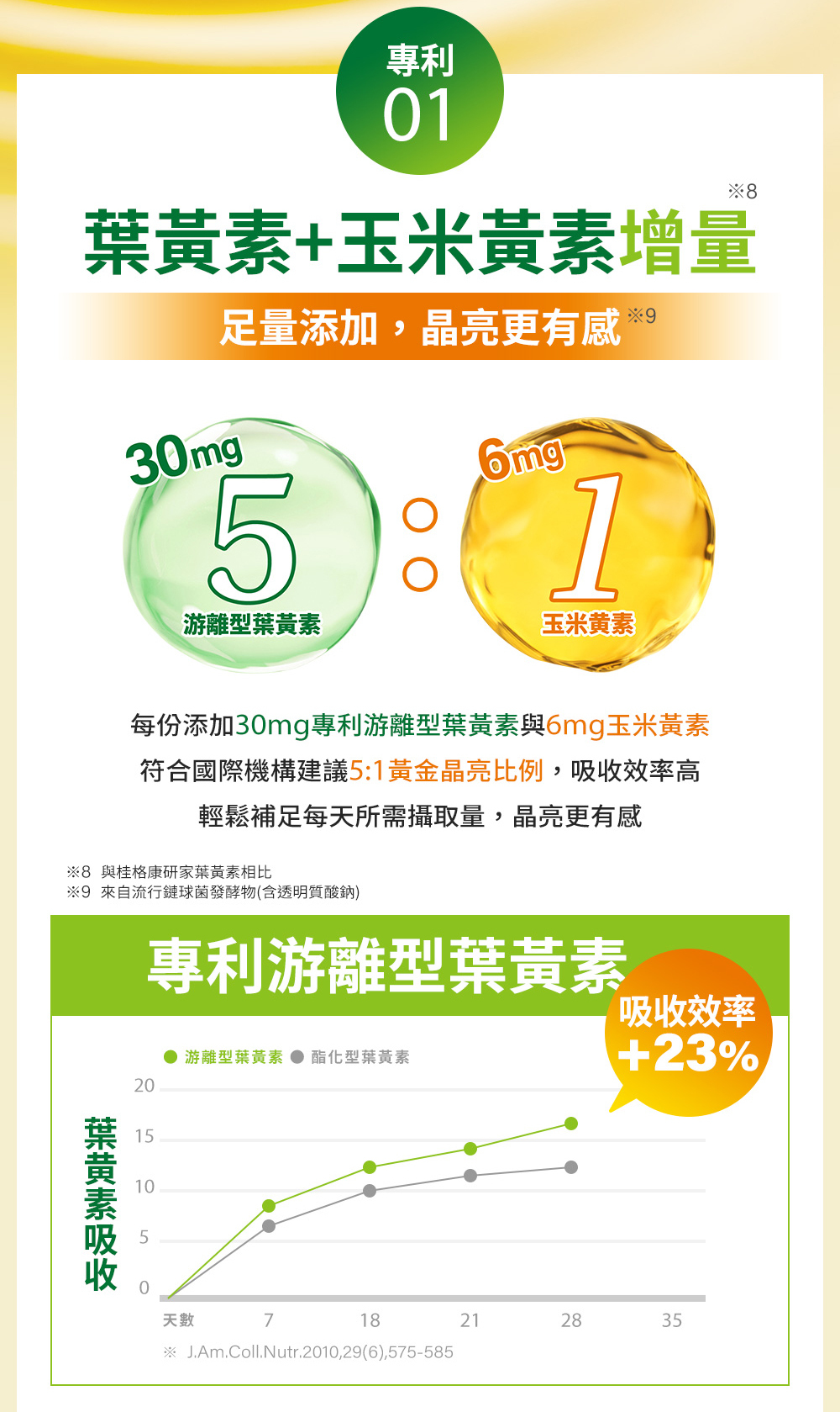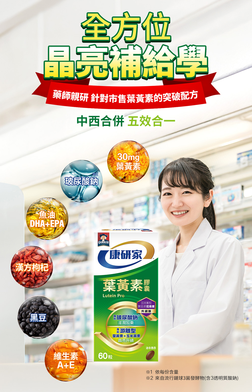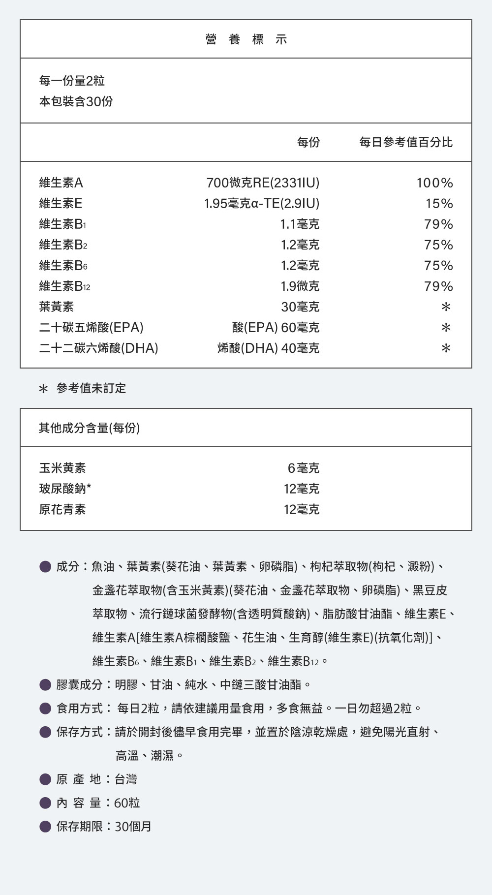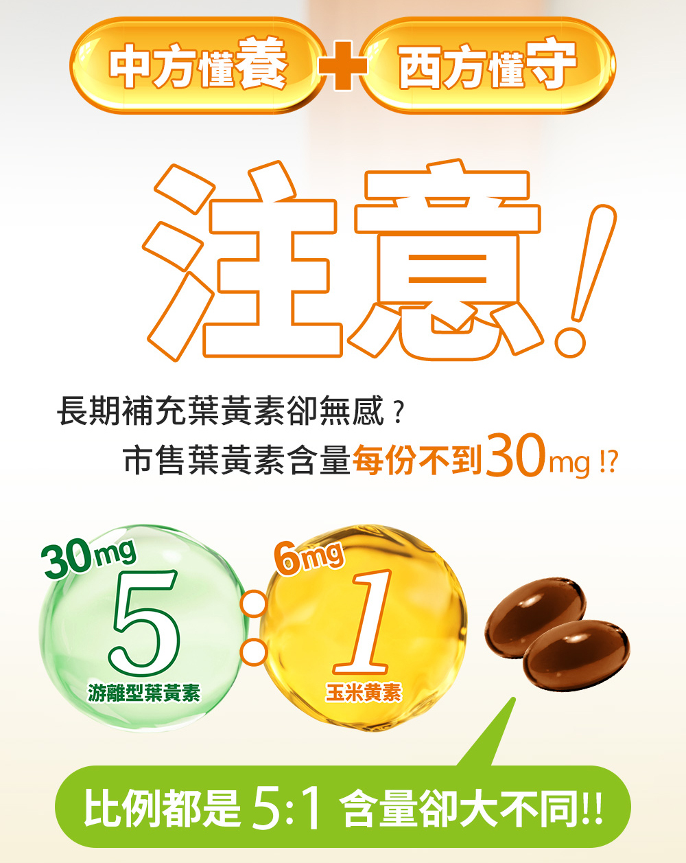 .晶亮黃金比例5:1-每份30mg游離型葉黃素與6mg玉米黃素,符合美國國家級機構建議比例