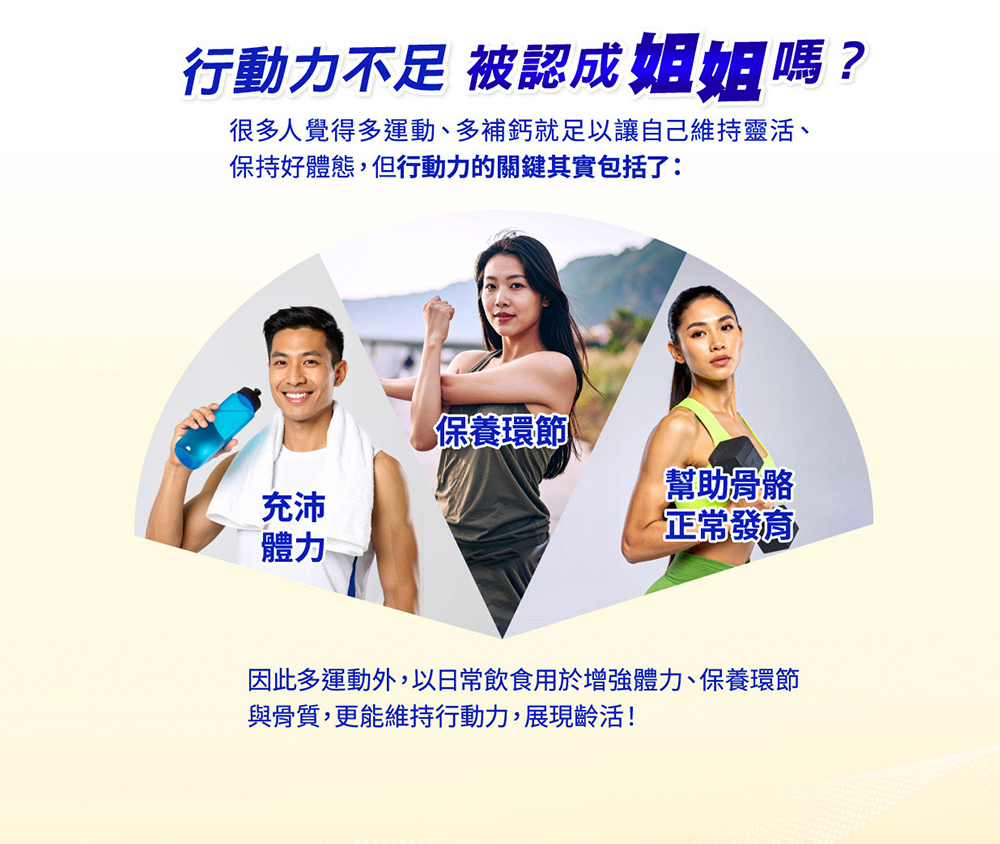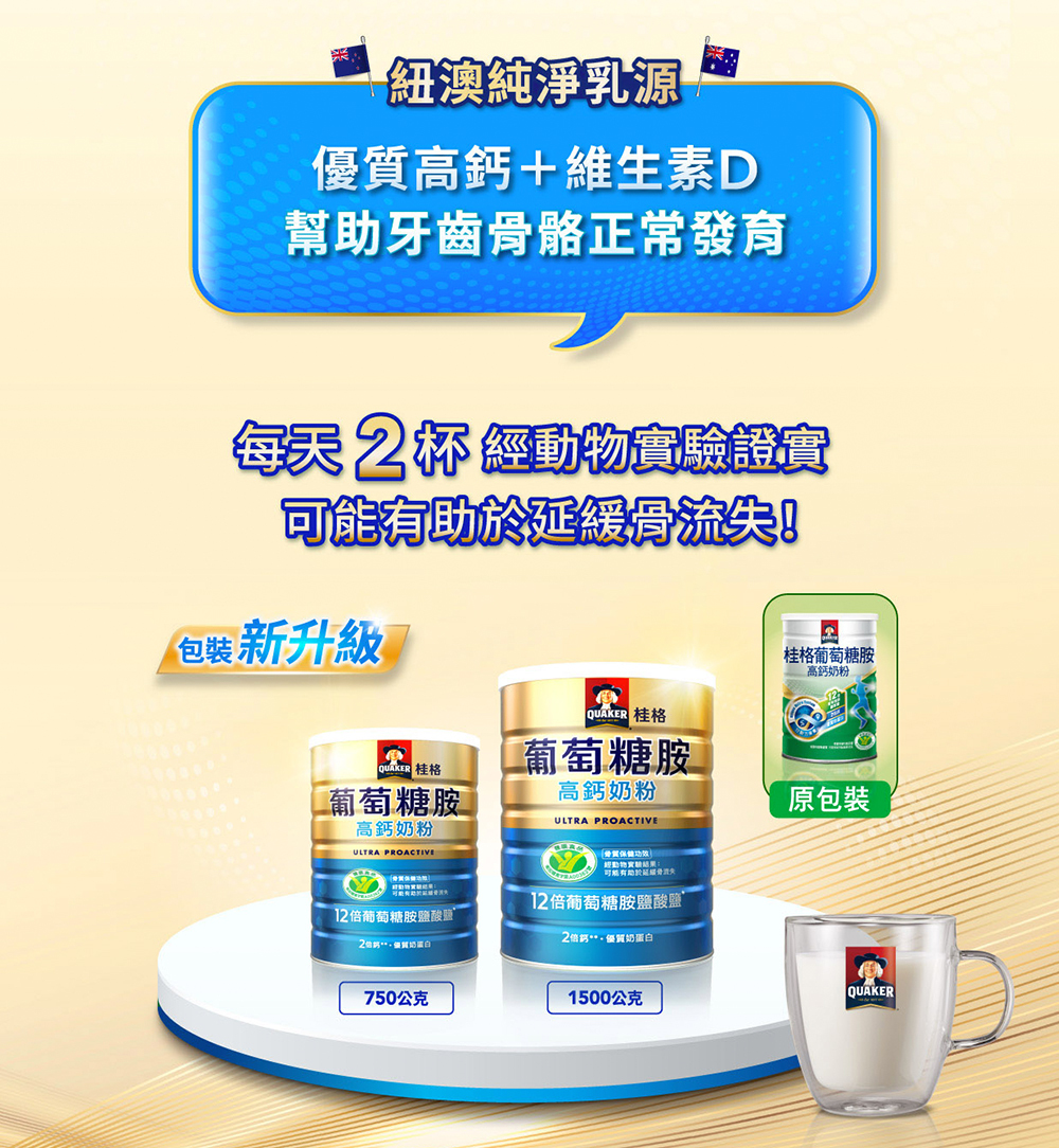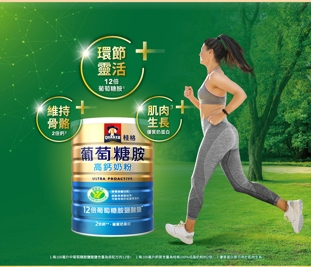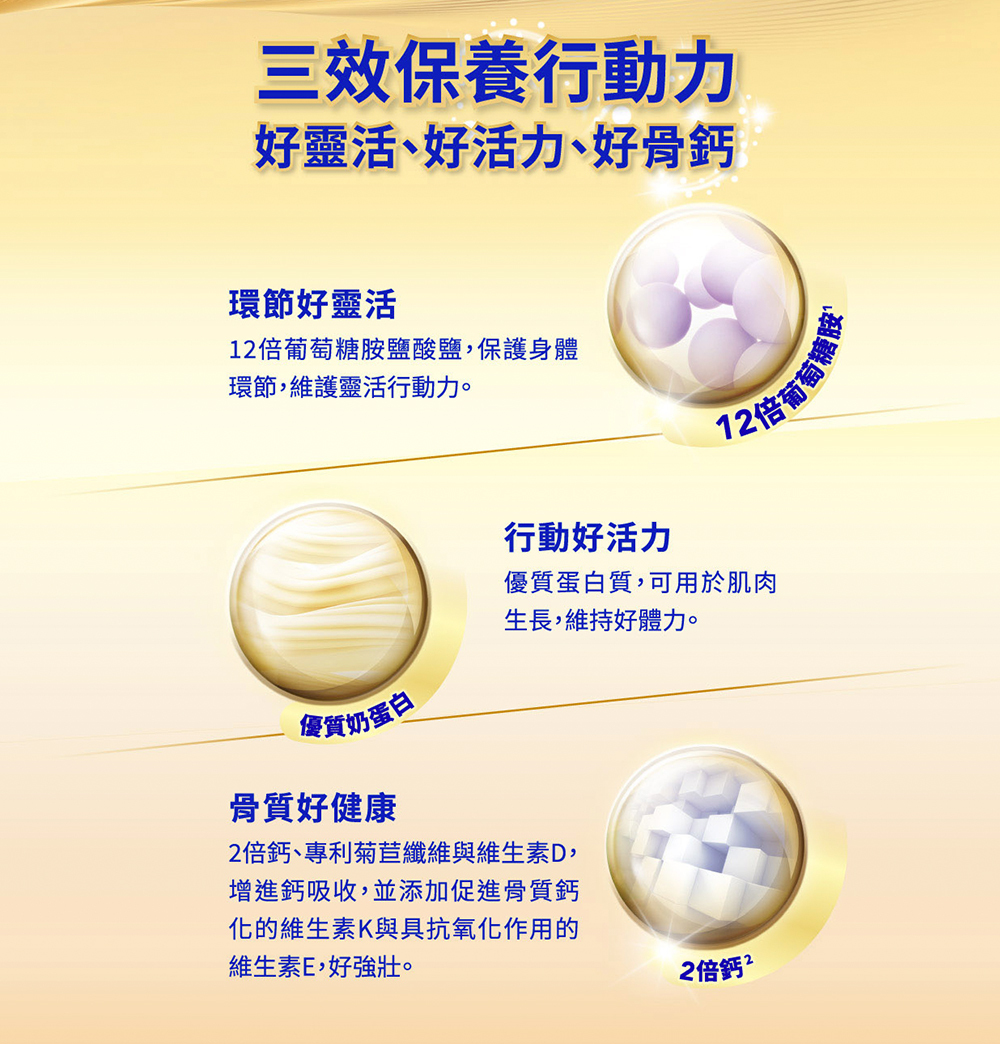 .添加12倍葡萄糖胺、2倍鈣、優質奶蛋白*,三效保養