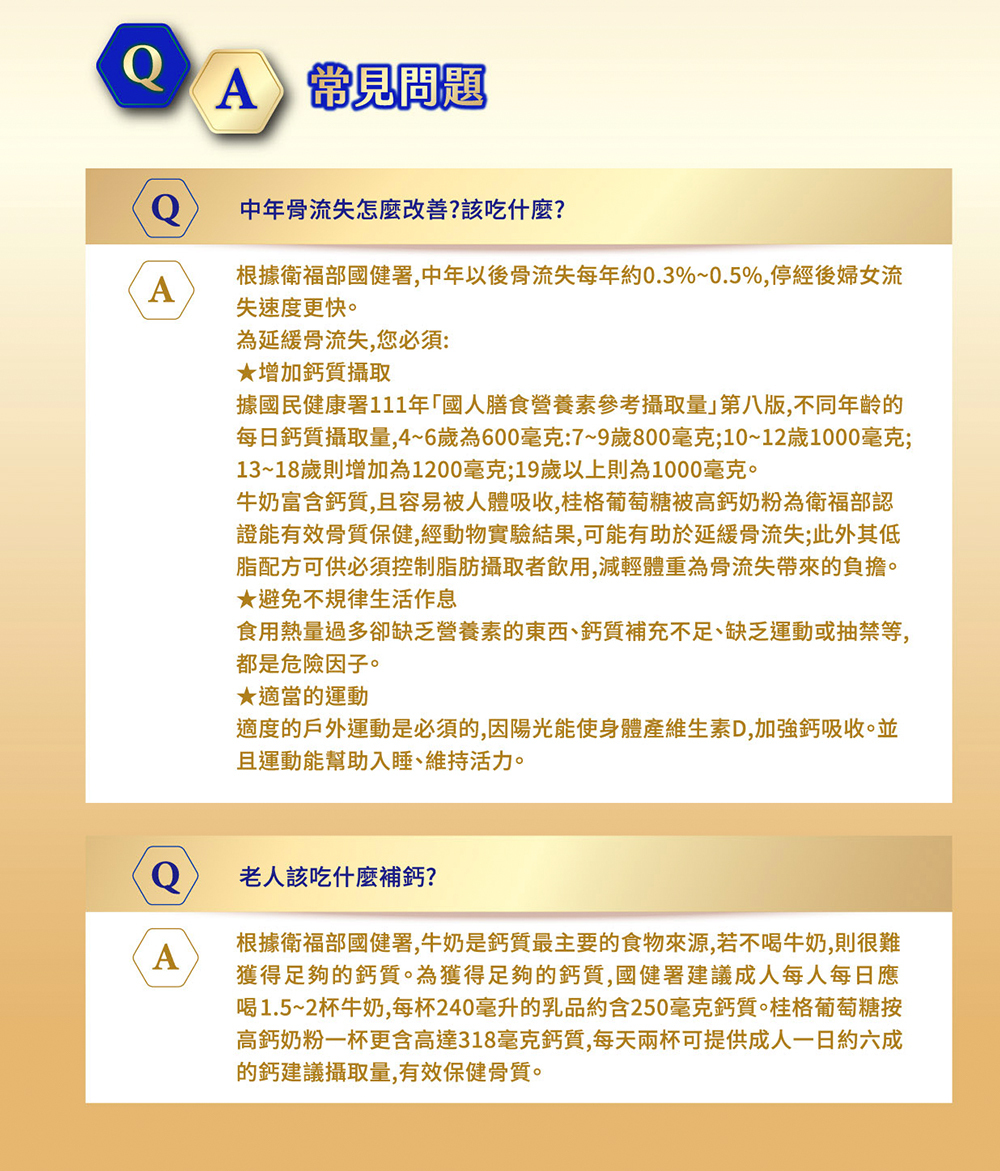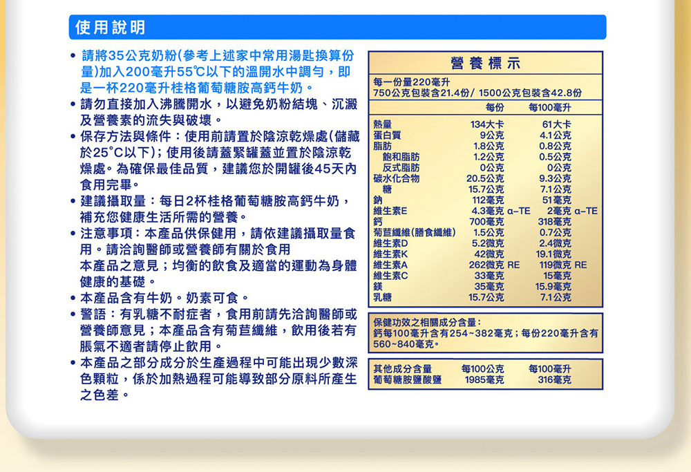 | 成分/內容物 | 脫脂奶粉、全脂奶粉、麥芽糊精、菊糖(菊苣纖維)、碳酸鈣(含超微鈣)、葡萄糖胺鹽酸鹽、磷酸鎂、維生素(維生素C、維生素E、維生素A、維生素K1、維生素D3)、辛烯基丁二酸鈉澱粉、阿拉伯膠、蔗糖、玉米澱粉、中鏈三酸甘油酯(MCT)、二氧化矽、維生素E(抗氧化劑)。 |