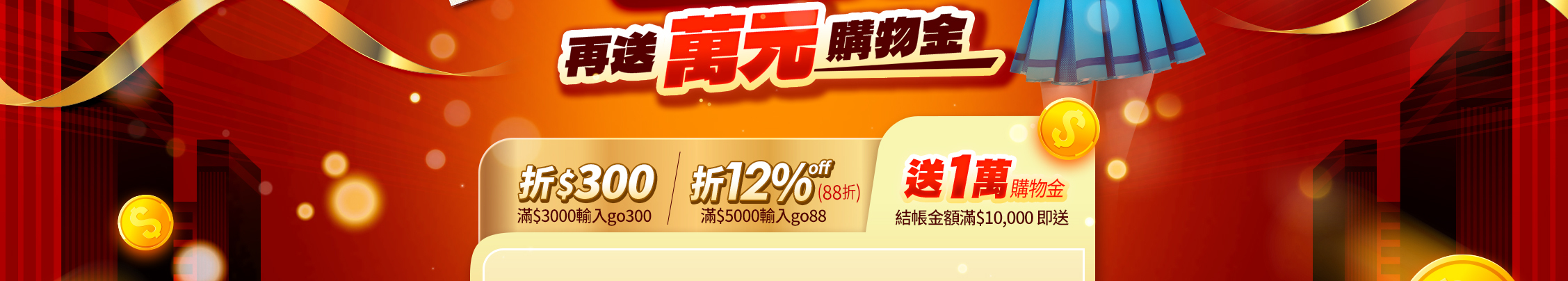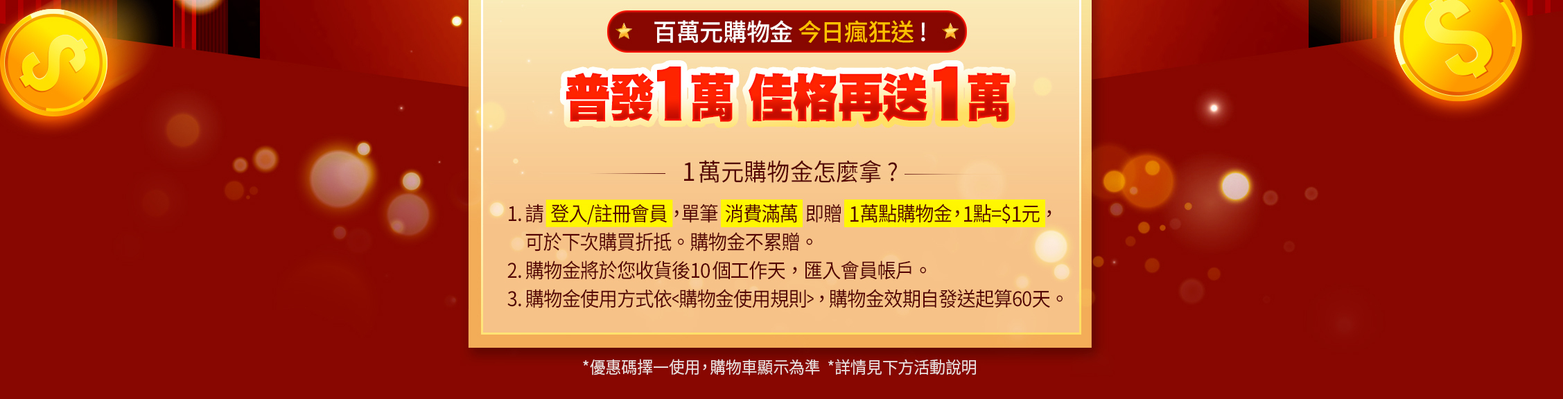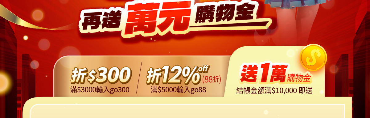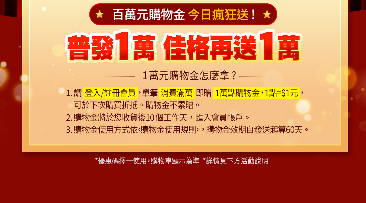 • 全館結帳滿$10,000送10,000購物金,以整筆訂單折扣後的結帳金額計算,單筆不累贈,以購物車顯示為準,且下次使用。