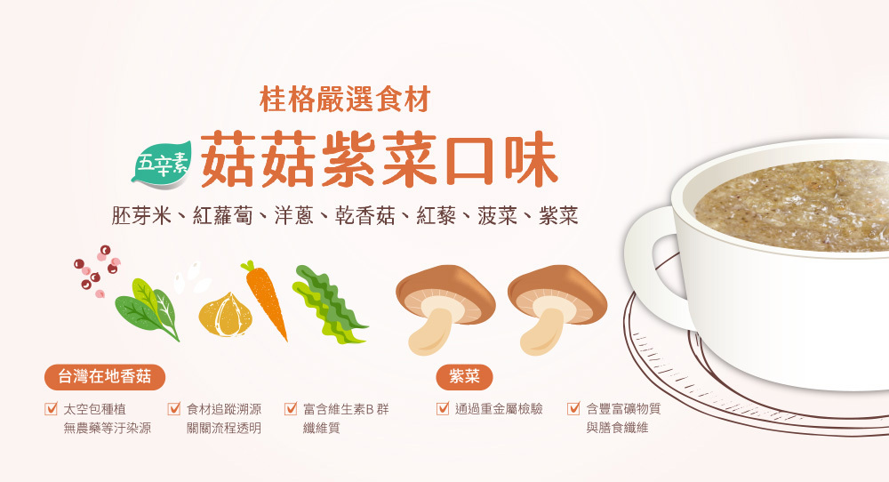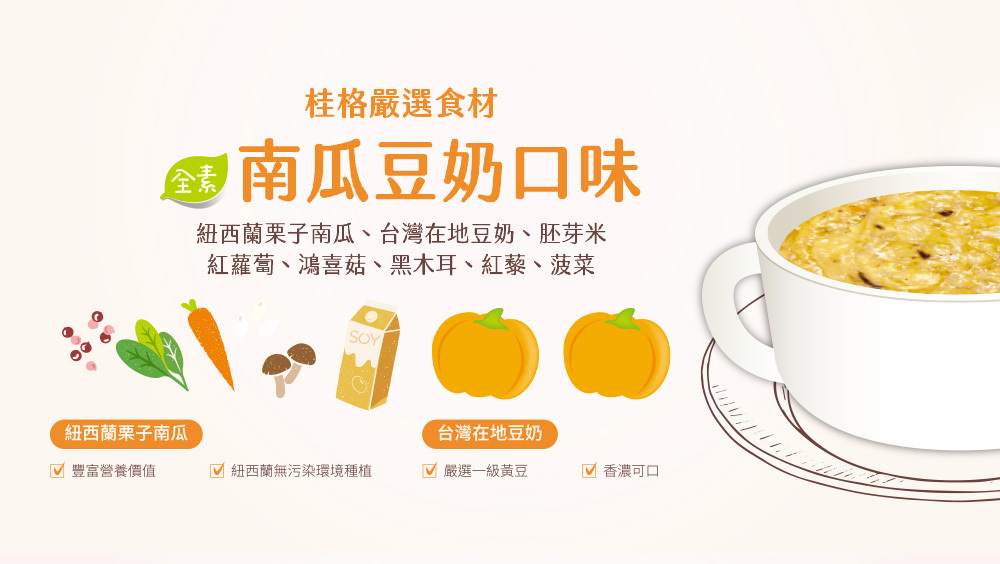 .南瓜口味:紐西蘭栗子南瓜、台灣在地豆奶、胚芽米、紅蘿蔔、鴻喜菇、黑木耳、紅藜、菠菜