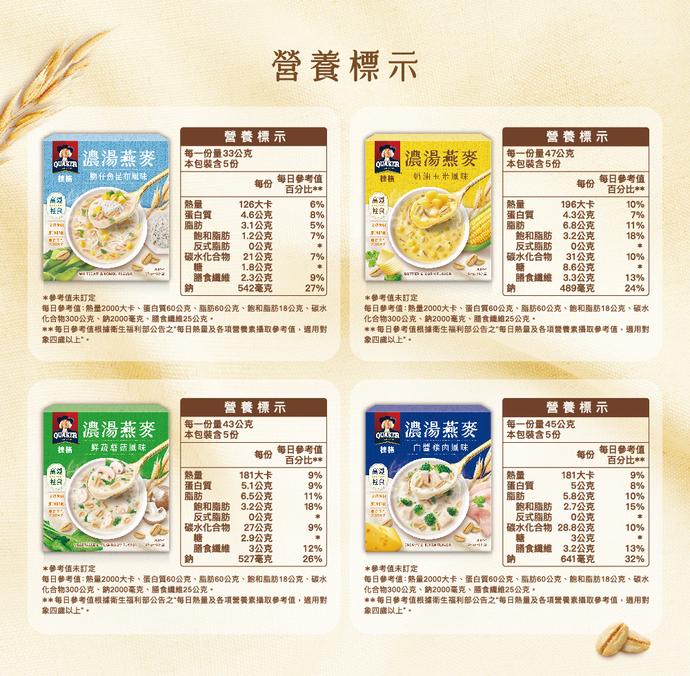 | 成分/內容物 | 白醬雞肉:大燕麥片、馬鈴薯、麥芽糊精、燕麥粉、蔗糖、乳脂粉(乳脂、脫脂乳粉)、非氫化棕櫚仁油、酵母抽出物、食鹽、小麥纖維、雞肉粒(雞肉、食鹽、麩胺酸鈉、麥芽糊精)、花椰菜、香料、乳清粉、關華豆膠、切達起士、洋香菜葉(巴西里葉)、調味劑(5’-次黃嘌呤核苷磷酸二鈉、5’-鳥嘌呤核苷磷酸二鈉)、琥珀酸二鈉、維生素E-抗氧化劑。玉米濃湯:大燕麥片、玉米、蔗糖、麥芽糊精、非氫化棕櫚仁油、乳脂粉(乳脂、脫脂乳粉)、馬鈴薯粉、小麥纖維、食鹽、酵母抽出物、香料、燕麥、乳清粉、關華豆膠、調味劑(5’-次黃嘌呤核?磷酸二鈉、5’-鳥嘌呤核?磷酸二鈉)、β-胡蘿蔔素、洋香菜葉(巴西里葉)、黑胡椒粉、琥珀酸二鈉、維生素E-抗氧化劑。洋蔥起司:大燕麥片、燕麥粉、麥芽糊精、蔗糖、洋蔥、酵母抽出物、非氫化棕櫚仁油、起士粉、乳脂粉(乳脂、脫脂乳粉)、食鹽、小麥纖維、蘋果、香料、乳清粉、馬鈴薯、關華豆膠、薑黃、調味劑(5’-次黃嘌呤核?磷酸二鈉、5’-鳥嘌呤核?磷酸二鈉)、洋香菜葉(巴西里葉)、維生素E-抗氧化劑。番茄牛肉:大燕麥片、燕麥粉、麥芽糊精、蔗糖、番茄粉、香料、酵母抽出物、非氫化棕櫚仁油、食鹽、乳脂粉(乳脂、脫脂乳粉)、牛肉(牛肉、玉米澱粉、食鹽、味精)、小麥纖維、洋蔥、菠菜、乳清粉、關華豆膠、紅甜菜粉、β-胡蘿蔔素、洋香菜葉(巴西里葉)、調味劑(5'-次黃嘌呤核苷磷酸二鈉、5'-鳥嘌呤核苷磷酸二鈉)、黑胡椒、綜合香草[奧勒岡葉、羅勒葉、迷迭香葉、蒜粒、紅辣椒、馬郁蘭葉、洋香菜葉(巴西里葉)]、維生素E-抗氧化劑。鮮蔬蘑菇:大燕麥片、什錦蔬菜(馬鈴薯、蘑菇、菠菜、洋香菜葉(巴西里葉))、非氫化棕櫚仁油、蔗糖、乳脂粉(乳脂、脫脂乳粉)、燕麥、分離大豆蛋白、小麥纖維、酵母抽出物、食鹽、乳清粉、香料、關華豆膠、調味劑(5’-次黃嘌呤核?磷酸二鈉、5’-鳥嘌呤核?磷酸二鈉)、白胡椒粉、維生素E-抗氧化劑。 |