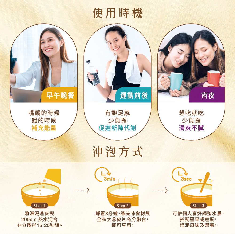 | 成分/內容物 | 白醬雞肉:大燕麥片、馬鈴薯、麥芽糊精、燕麥粉、蔗糖、乳脂粉(乳脂、脫脂乳粉)、非氫化棕櫚仁油、酵母抽出物、食鹽、小麥纖維、雞肉粒(雞肉、食鹽、麩胺酸鈉、麥芽糊精)、花椰菜、香料、乳清粉、關華豆膠、切達起士、洋香菜葉(巴西里葉)、調味劑(5’-次黃嘌呤核苷磷酸二鈉、5’-鳥嘌呤核苷磷酸二鈉)、琥珀酸二鈉、維生素E-抗氧化劑。玉米濃湯:大燕麥片、玉米、蔗糖、麥芽糊精、非氫化棕櫚仁油、乳脂粉(乳脂、脫脂乳粉)、馬鈴薯粉、小麥纖維、食鹽、酵母抽出物、香料、燕麥、乳清粉、關華豆膠、調味劑(5’-次黃嘌呤核?磷酸二鈉、5’-鳥嘌呤核?磷酸二鈉)、β-胡蘿蔔素、洋香菜葉(巴西里葉)、黑胡椒粉、琥珀酸二鈉、維生素E-抗氧化劑。洋蔥起司:大燕麥片、燕麥粉、麥芽糊精、蔗糖、洋蔥、酵母抽出物、非氫化棕櫚仁油、起士粉、乳脂粉(乳脂、脫脂乳粉)、食鹽、小麥纖維、蘋果、香料、乳清粉、馬鈴薯、關華豆膠、薑黃、調味劑(5’-次黃嘌呤核?磷酸二鈉、5’-鳥嘌呤核?磷酸二鈉)、洋香菜葉(巴西里葉)、維生素E-抗氧化劑。番茄牛肉:大燕麥片、燕麥粉、麥芽糊精、蔗糖、番茄粉、香料、酵母抽出物、非氫化棕櫚仁油、食鹽、乳脂粉(乳脂、脫脂乳粉)、牛肉(牛肉、玉米澱粉、食鹽、味精)、小麥纖維、洋蔥、菠菜、乳清粉、關華豆膠、紅甜菜粉、β-胡蘿蔔素、洋香菜葉(巴西里葉)、調味劑(5'-次黃嘌呤核苷磷酸二鈉、5'-鳥嘌呤核苷磷酸二鈉)、黑胡椒、綜合香草[奧勒岡葉、羅勒葉、迷迭香葉、蒜粒、紅辣椒、馬郁蘭葉、洋香菜葉(巴西里葉)]、維生素E-抗氧化劑。鮮蔬蘑菇:大燕麥片、什錦蔬菜(馬鈴薯、蘑菇、菠菜、洋香菜葉(巴西里葉))、非氫化棕櫚仁油、蔗糖、乳脂粉(乳脂、脫脂乳粉)、燕麥、分離大豆蛋白、小麥纖維、酵母抽出物、食鹽、乳清粉、香料、關華豆膠、調味劑(5’-次黃嘌呤核?磷酸二鈉、5’-鳥嘌呤核?磷酸二鈉)、白胡椒粉、維生素E-抗氧化劑。 |