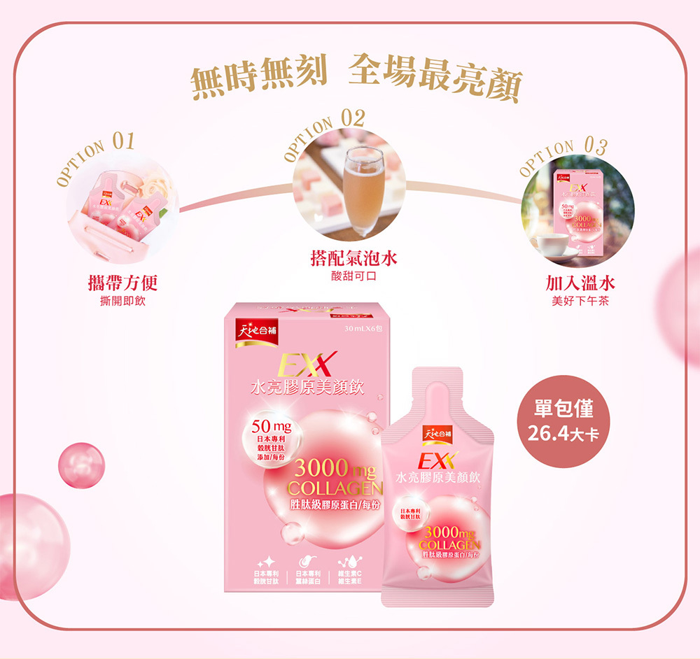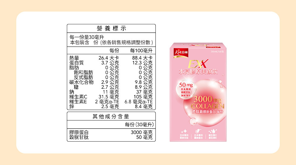 | 成分/內容物 | 水、膠原蛋白、水蜜桃濃縮汁、紅葡萄濃縮汁、蔓越莓濃縮汁、黑醋栗濃縮汁、冰糖、蠶絲蛋白(蠶絲蛋白、樹薯糊精)、檸檬濃縮汁、維生素C、香料、覆盆莓濃縮汁、蘋果濃縮汁、異麥芽寡醣、流行鏈球菌發酵物(含透明質酸鈉)、鋅酵母*、穀胱甘肽、葡萄糖酸鈉、維生素E、蔗糖素(甜味劑)。*本產品具有鋅,可增進皮膚健康。 |