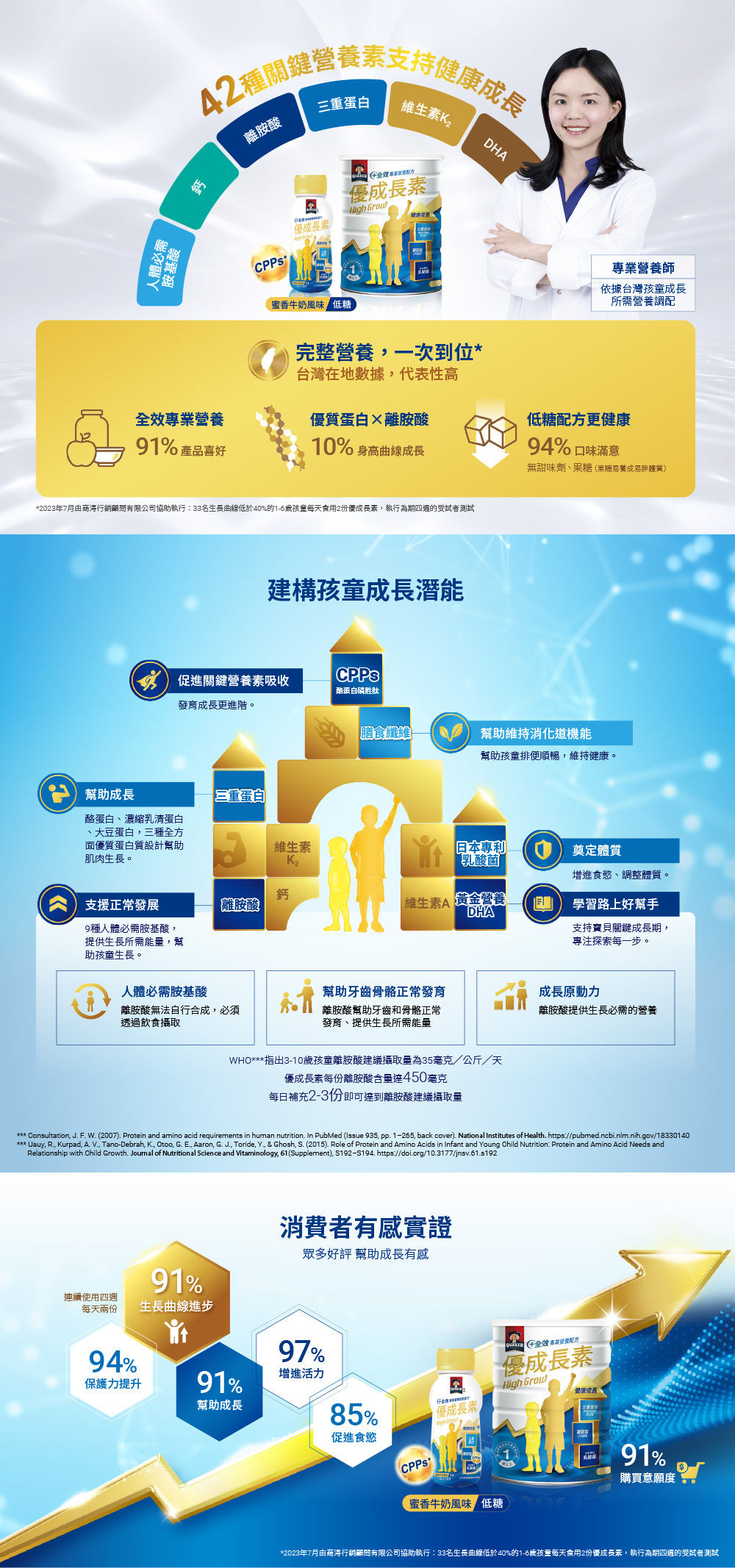 .42 種關鍵營養素 (人體必備胺基酸、鈣、離胺酸、CPPs、三重蛋白、維生素K2、藻油DHA),補充成長所需!