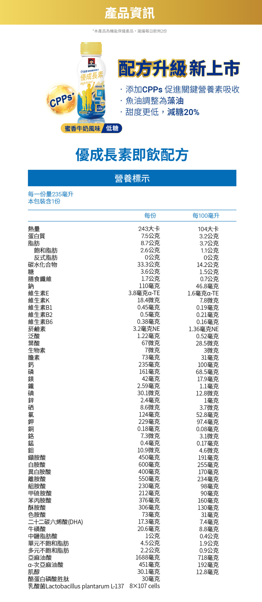 | 成分/內容物 | 去離子水、麥芽糊精、酪蛋白鈣、芥花油、蔗糖、葵花油、難消化性麥芽糊精、MCT(中鏈三酸甘油酯)、酪蛋白鈉、檸檬酸鉀、單及雙脂肪酸甘油二乙醯酒石酸酯(乳化劑)、菊糖(纖維)、酪蛋白水解物(含酪蛋白磷酸胜肽CPPs)、香料、 磷酸氫鈣(無水)、磷酸鎂、氯化鈉、碳酸鈣、濃縮乳清蛋白、藻油粉(含DHA)(乾燥葡萄糖漿、DHA藻油、葵花油、卵磷脂)、濃縮乳清蛋白、分離大豆蛋白、磷酸氫二鉀、氯化膽生僉、鹿角菜膠、維生素C、肌醇、牛磺酸、葡萄糖酸鋅、維生素E、焦磷酸鐵、鷹嘴豆發酵萃取物 [阿拉伯膠、蔗糖、鷹嘴豆發酵萃取物(含維生素K2) ]、鉬酵母、乳酸菌粉(糊精、乳酸菌Lactobacillus plantarum L137)、維生素A、菸鹼醯胺、本多酸鈣、維生素D3、維生素B1、硫酸錳、維生素B2、維生素B12、維生素B6、硫酸銅、維生素K1、葉酸、吡啶甲酸鉻、碘化鉀、硒酸鈉、生物素。 |